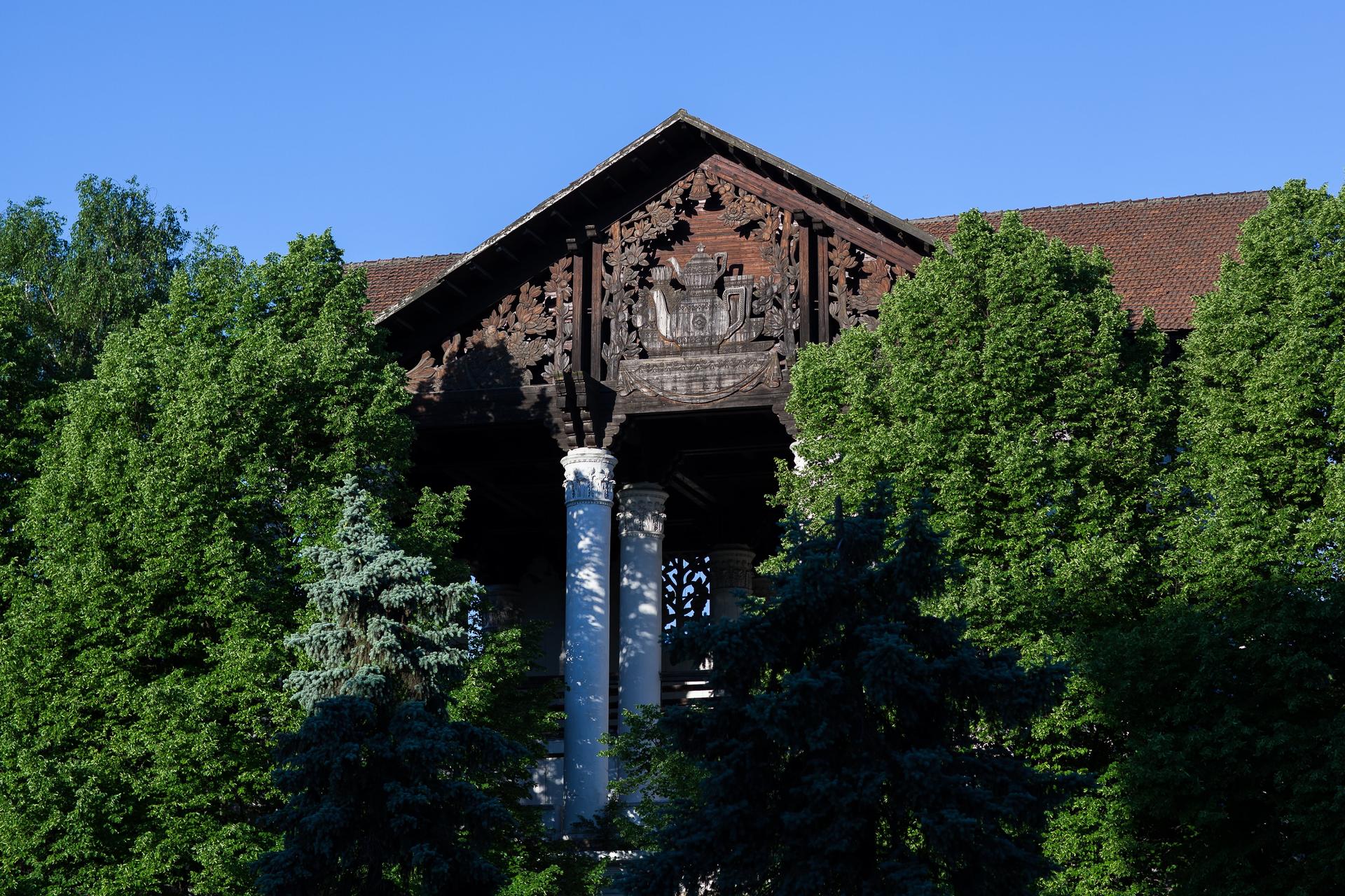 Непропорционально массивная центральная часть ресторана выделяется своими просторными портиками. Фронтоны украшены деревянными резными изображениями. Нужно отойти от здания на некоторое расстояние, чтобы рассмотреть на центральном фронтоне изображения двух расписных чайников на столе с вышитой скатертью в окружении листьев и плодов. Слева позади чайников возвышается ананас! Как указывалось в архитектурной печати начала 1950-х годов, такое оформление должно было подчеркивать народность стиля. По бокам от центрального объема расположены две башни, также двухэтажные. Второй этаж открытый. Позади здания размещаются просторные производственные помещения. Крыши ресторана покрыты черепицей – материалом, который, как считается, из-за сильных перепадов температур редко используется в средней полосе России. Кстати, черепичную крышу ресторана тоже довольно непросто разглядеть с земли.