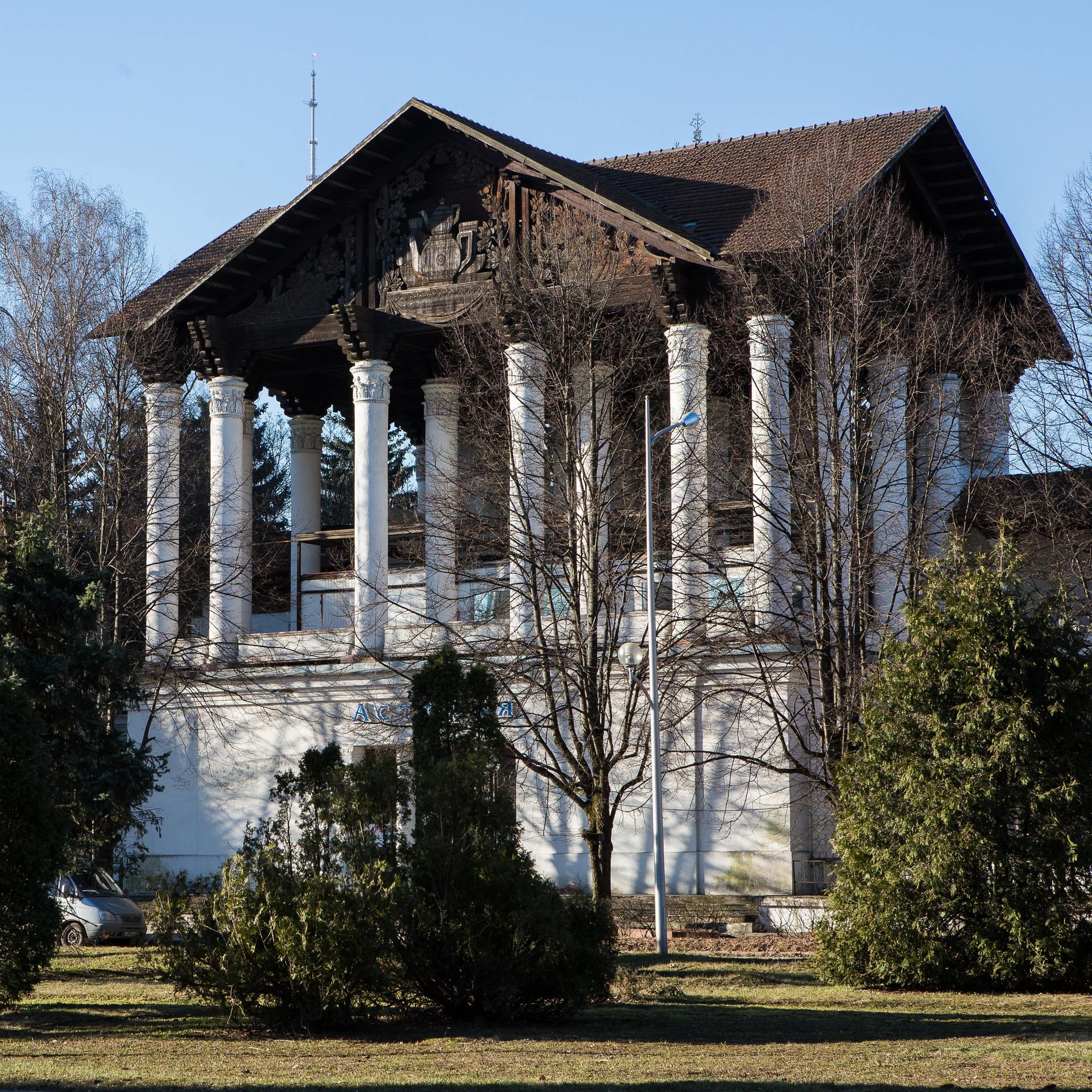Здание построено по проекту архитектора Л.И. Мариновского. Со стороны оно производит впечатление целого городка из отдельных домиков, соединенных открытыми галереями. Высокие деревья, разросшиеся вокруг здания за последние 60 лет, еще больше усиливают это впечатление. Галереи обращены в северную сторону, т.е. в жаркий летний день все посетители находятся в тени, с видом на живописный фасад павильона «Главмясо» и на купол павильона «Механизация» (то есть, «Космос»).