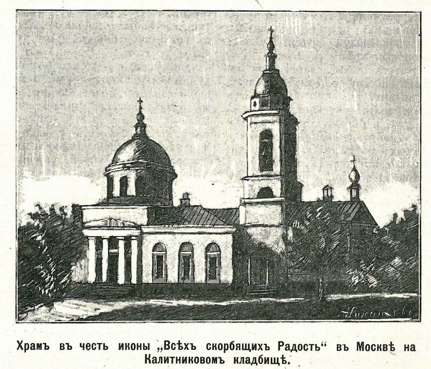 Деревянная церковь сгорела, и в 1834–1838 уже на новом месте по проекту архитектора Николая Козловского был построен каменный храм в честь иконы Богоматери Всех Скорбящих Радость с приделами Николая Чудотворца и Александра Невского в традиционном для того времени стиле ампир. В 1881 году ее перестроил архитектор В.Веригин. Ограда кладбища сооружена по проекту архитектора Н.Маркова.