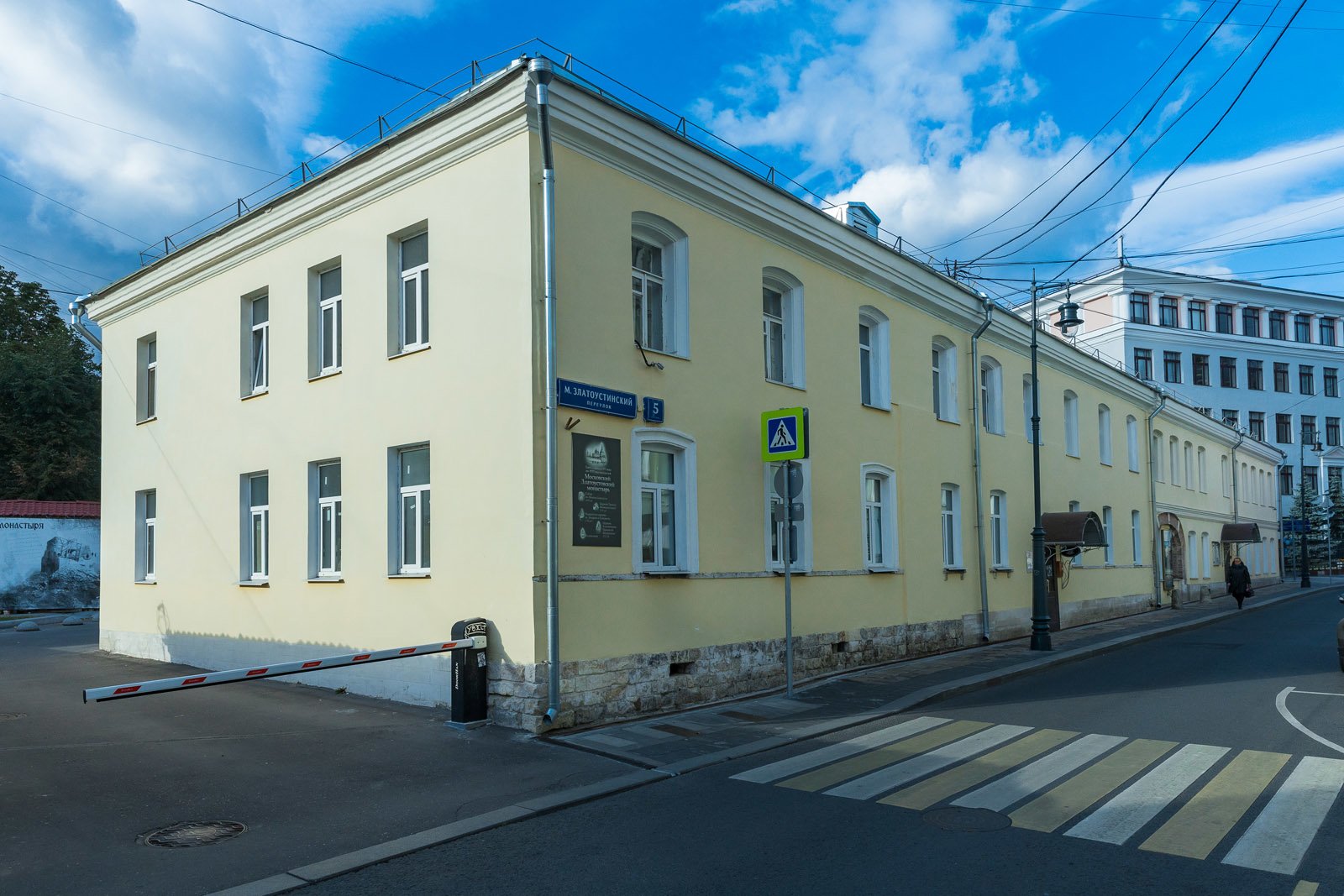 В 1862 г. в Малом Златоустинском переулке, рядом с хозяйственными воротами Златоустовского монастыря, было построено двухэтажное здание с проездной аркой (в начале ХХ в. арка была заложена). За домом закрепилось название «келейный корпус», так как он состоял из множества изолированных комнат (келий), но был предназначен не для монахов, а для сдачи внаём. Разрушив монастырь, большевики сохранили это здание как не имеющее прямого отношения к религии. Здесь были устроены коммунальные квартиры, затем в течение нескольких десятилетий находились службы ЖКХ.