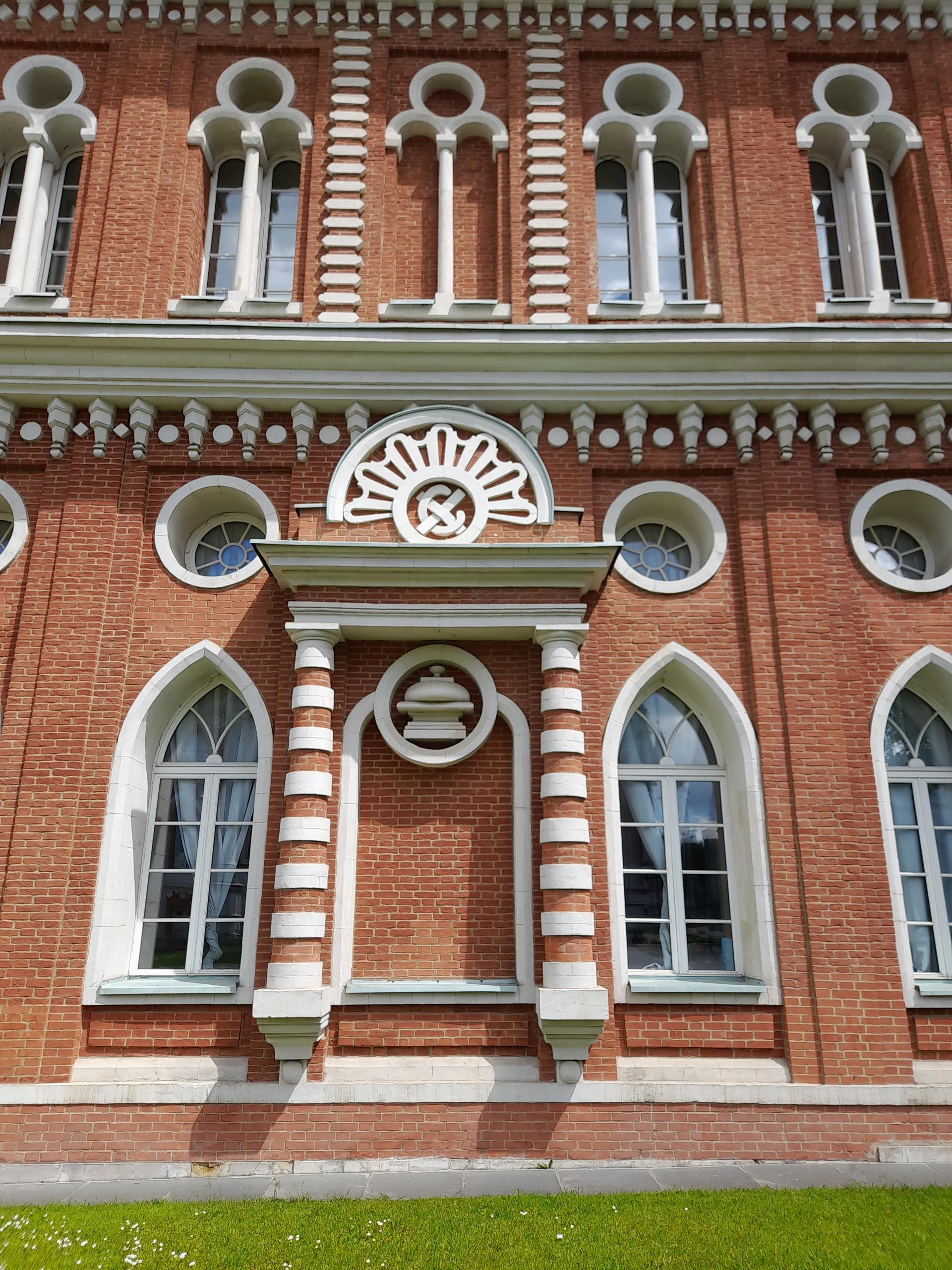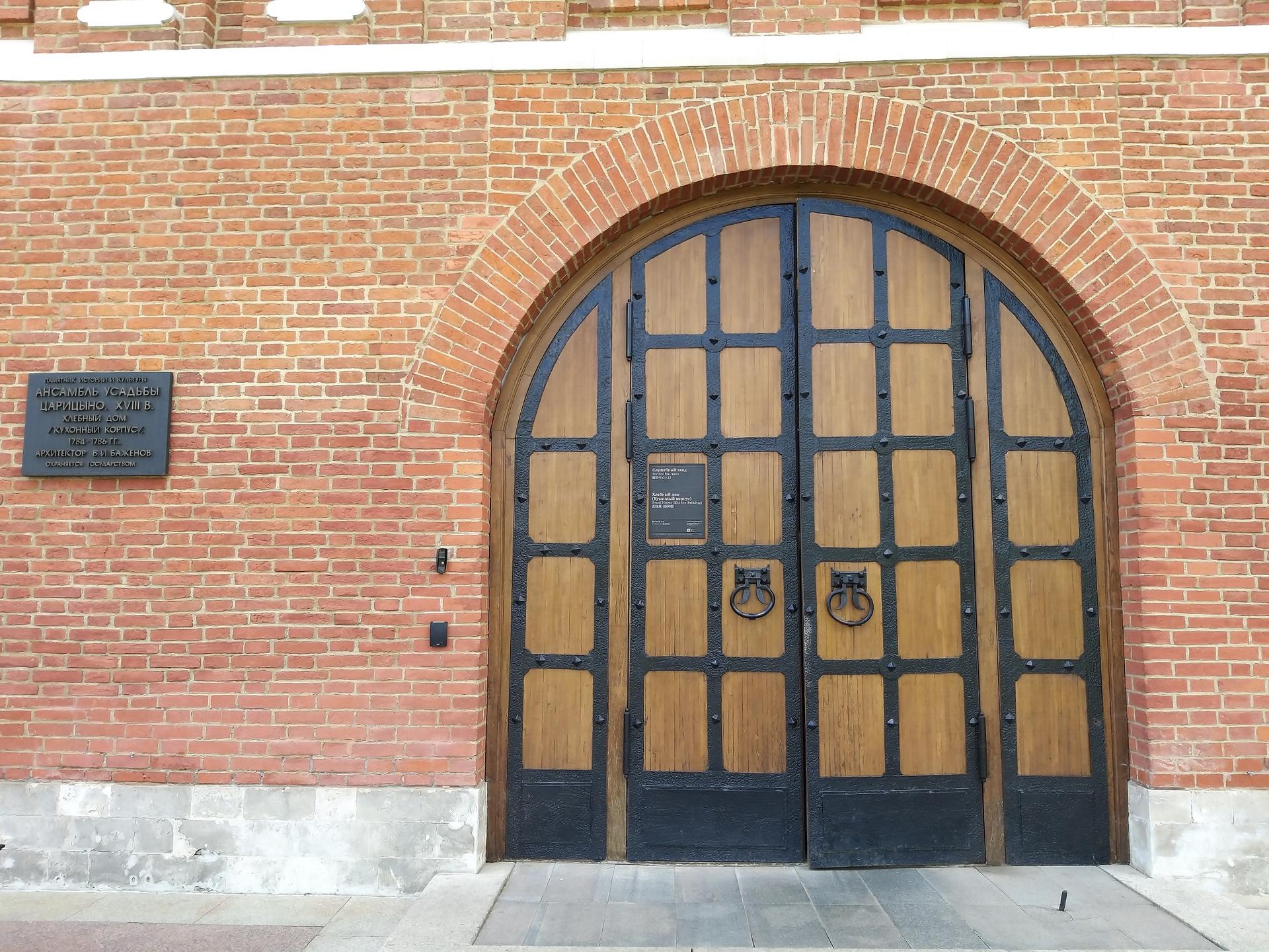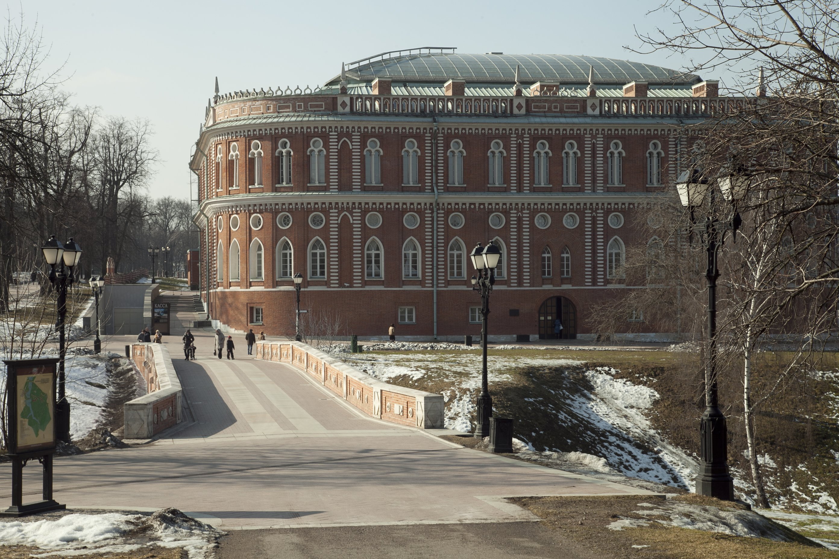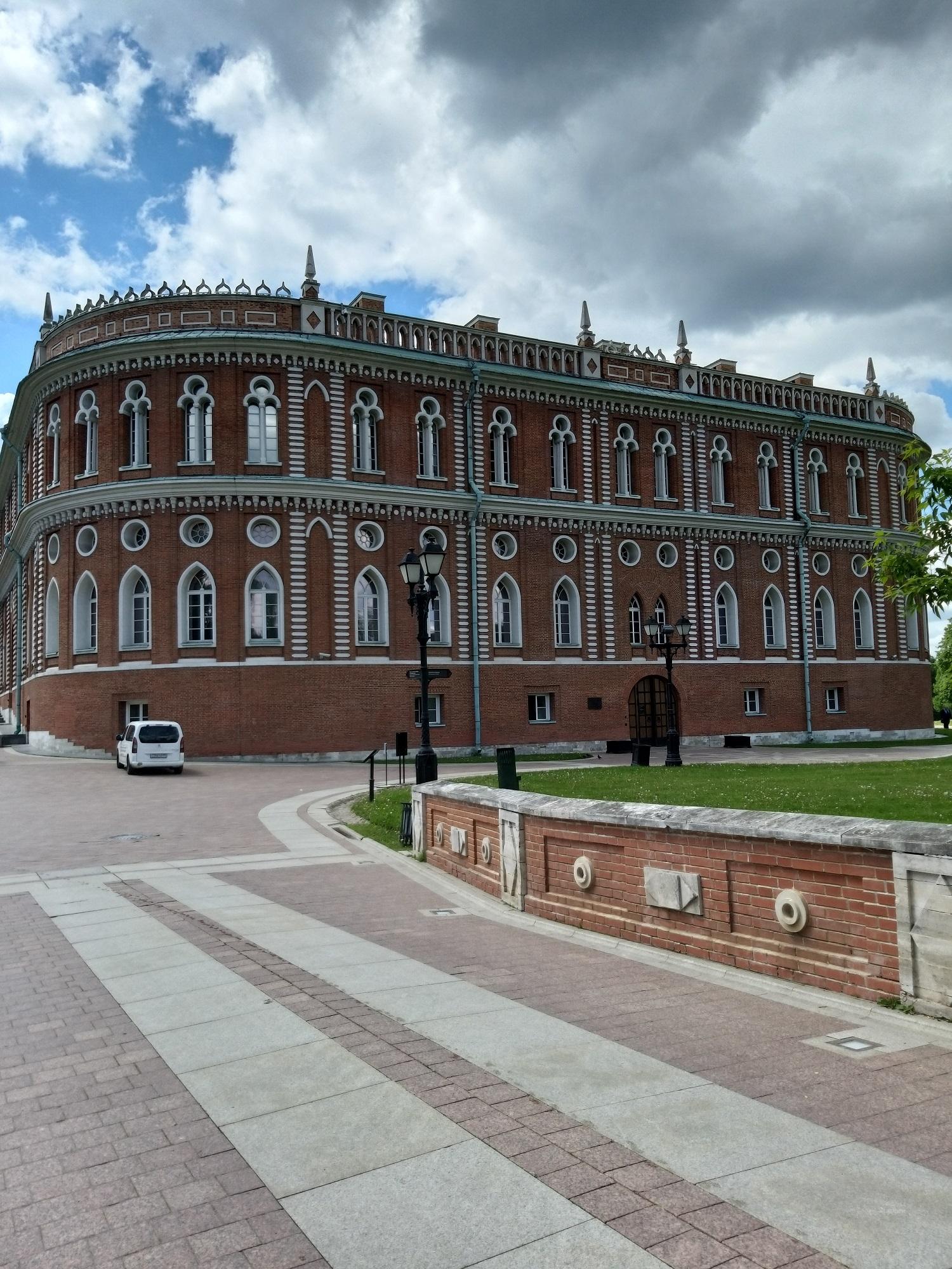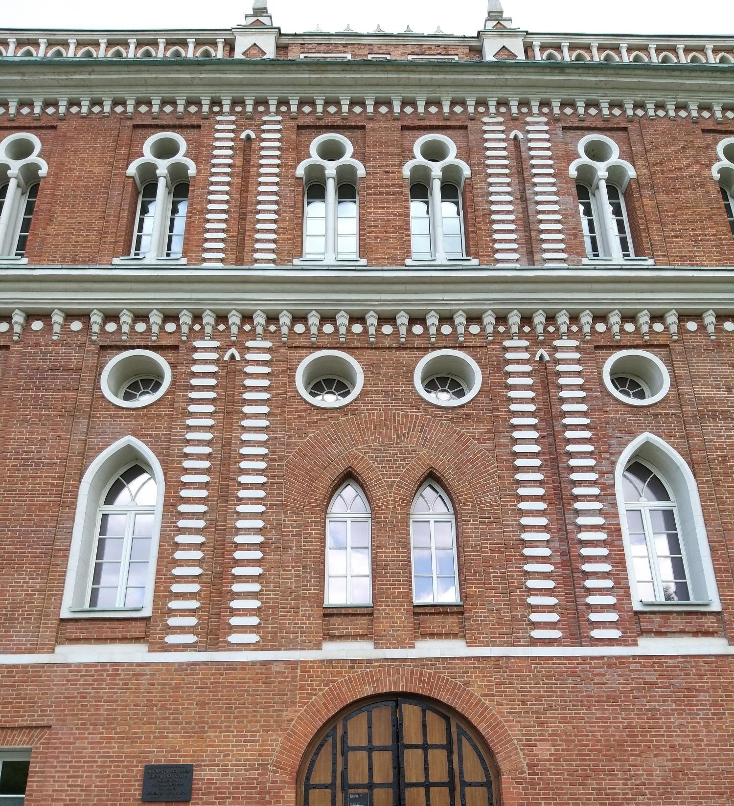 Перед нами самое крупное сооружение царицынского ансамбля — кухня императрицы Екатерины. Официально — «Кухонный корпус», а на жаргоне императорской обслуги — «Хлебный дом». Во время постройки Царицына архитектор Василий Баженов придумывает замаскировать хозяйственный блок под средневековый замок. Так здание будет меньше выбиваться из общего стиля. Баженов строит кухонный корпус в виде исполинского куба с закругленными углами. В постройке он отказывается от местных стройматериалов в пользу более влагоустойчивого белого камня из Хорошевских каменоломен. Фасады Баженов украшает эмблемой в виде каравая и солонки. Над ними – вензель из букв «Х» и «С» («хлеб» и «соль»).