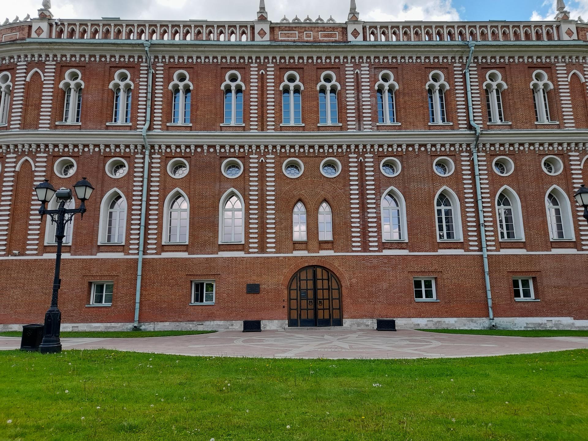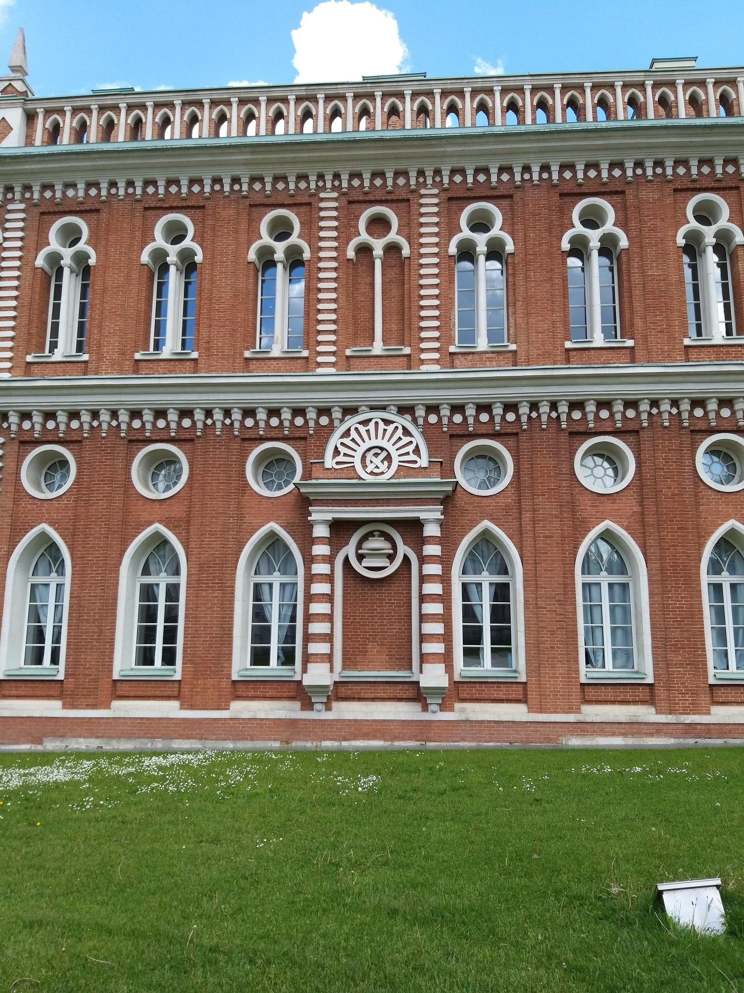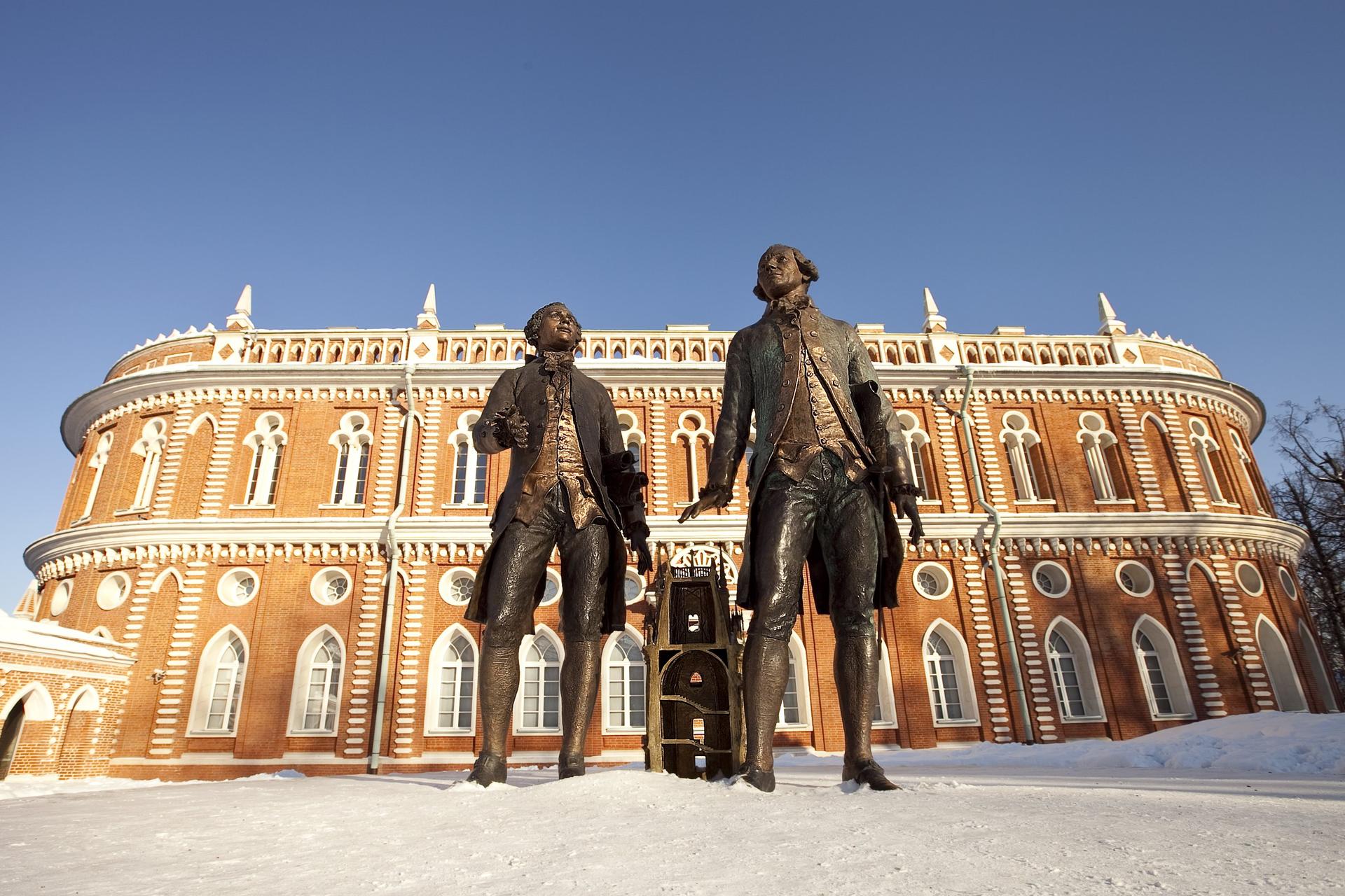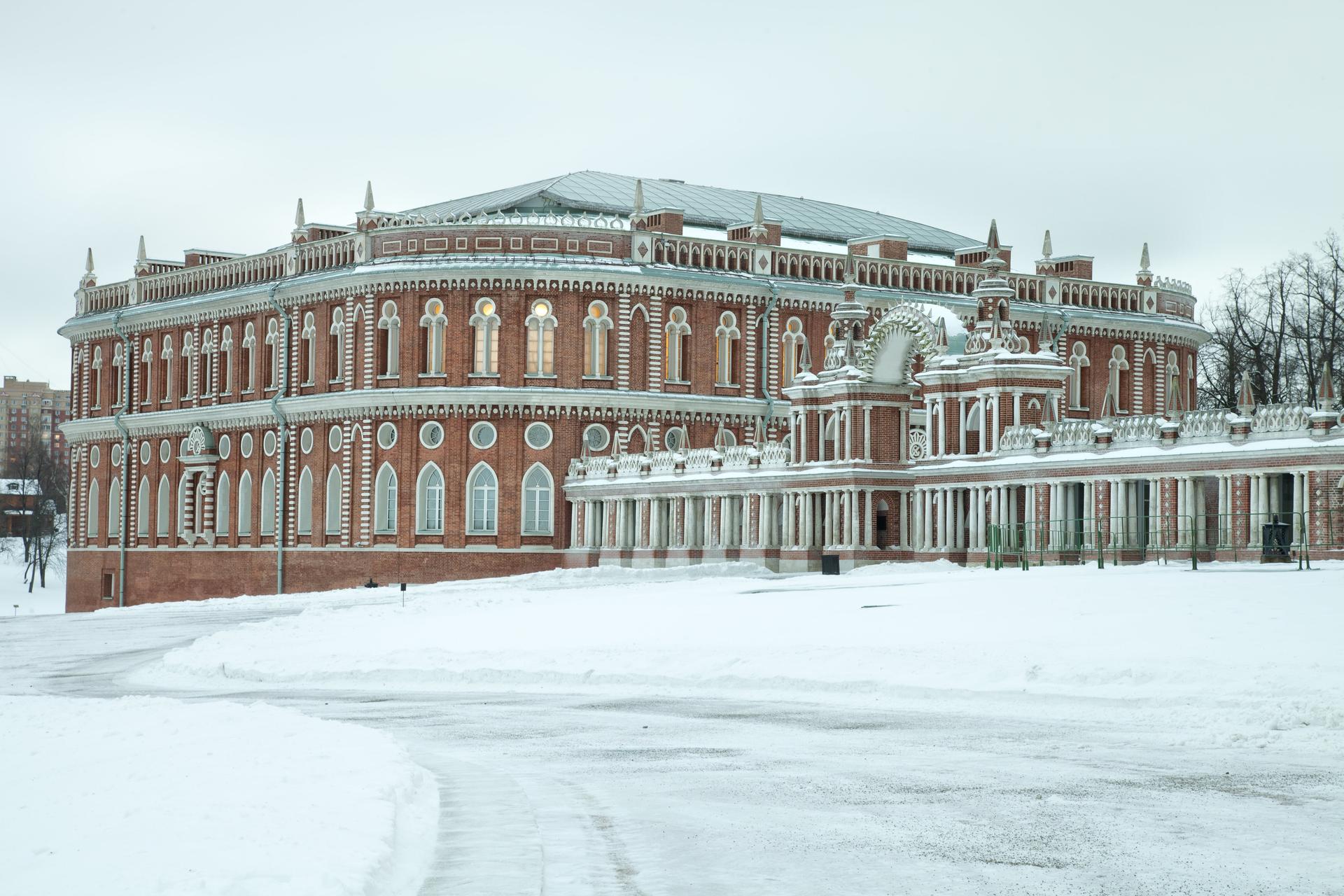 Перед нами самое крупное сооружение царицынского ансамбля — кухня императрицы Екатерины. Официально — «Кухонный корпус», а на жаргоне императорской обслуги — «Хлебный дом». Во время постройки Царицына архитектор Василий Баженов придумывает замаскировать хозяйственный блок под средневековый замок. Так здание будет меньше выбиваться из общего стиля. Баженов строит кухонный корпус в виде исполинского куба с закругленными углами. В постройке он отказывается от местных стройматериалов в пользу более влагоустойчивого белого камня из Хорошевских каменоломен. Фасады Баженов украшает эмблемой в виде каравая и солонки. Над ними – вензель из букв «Х» и «С» («хлеб» и «соль»).