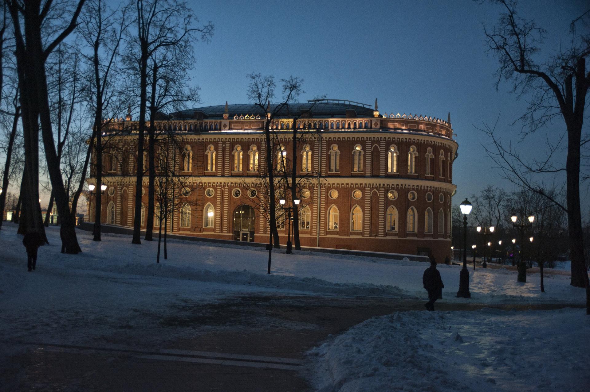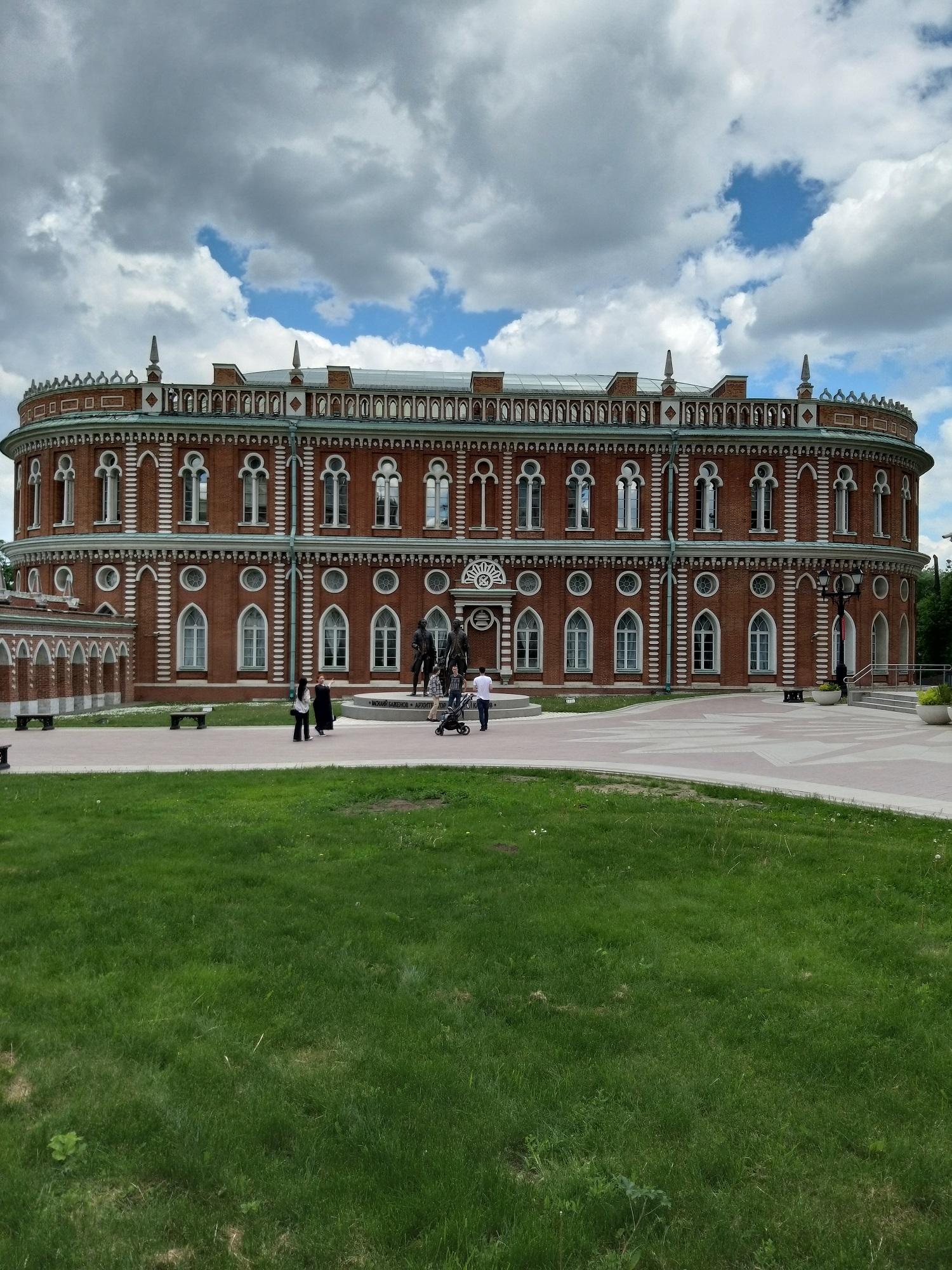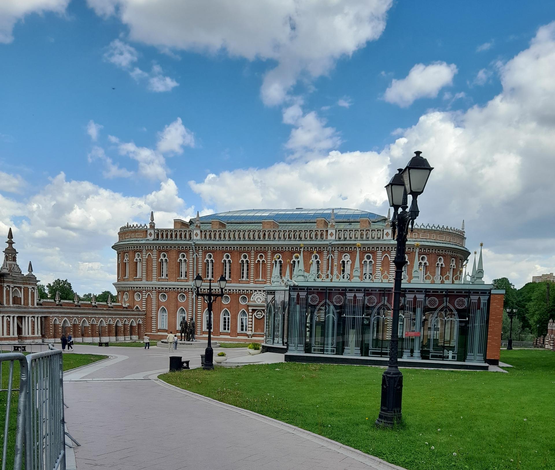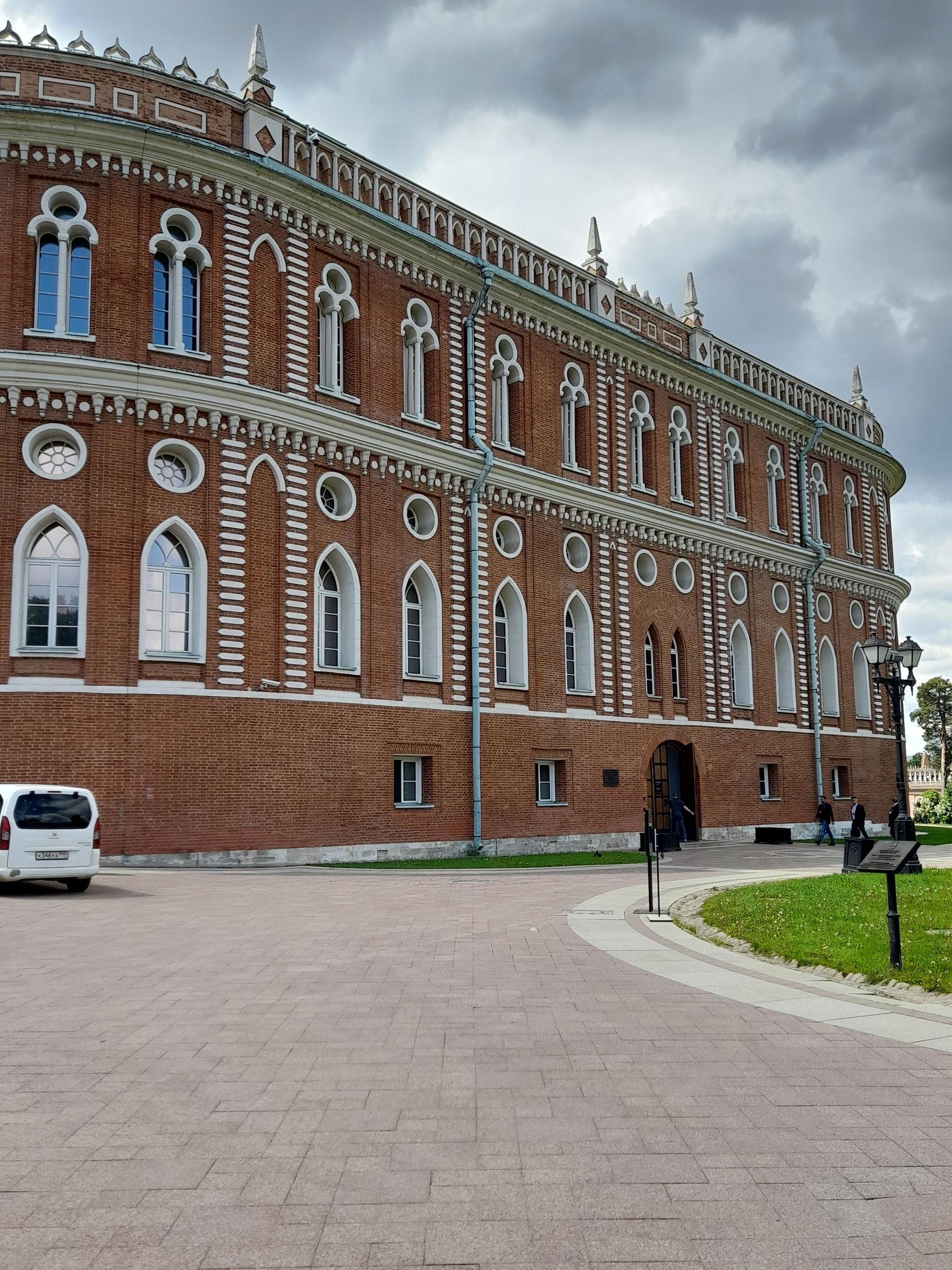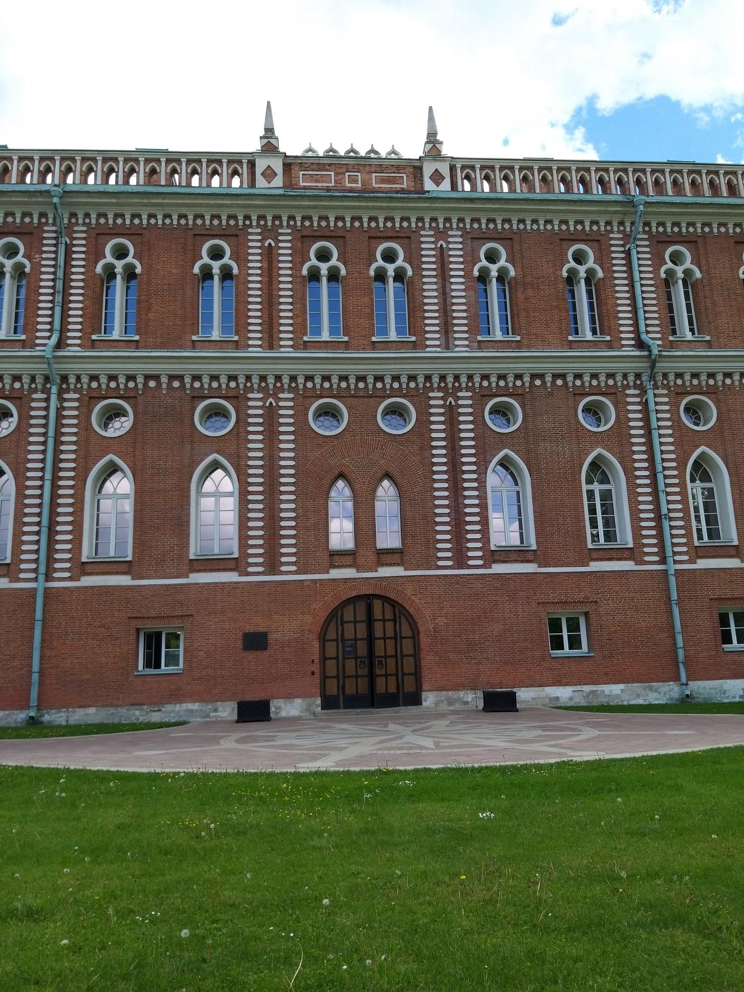 Перед нами самое крупное сооружение царицынского ансамбля — кухня императрицы Екатерины. Официально — «Кухонный корпус», а на жаргоне императорской обслуги — «Хлебный дом». Во время постройки Царицына архитектор Василий Баженов придумывает замаскировать хозяйственный блок под средневековый замок. Так здание будет меньше выбиваться из общего стиля. Баженов строит кухонный корпус в виде исполинского куба с закругленными углами. В постройке он отказывается от местных стройматериалов в пользу более влагоустойчивого белого камня из Хорошевских каменоломен. Фасады Баженов украшает эмблемой в виде каравая и солонки. Над ними – вензель из букв «Х» и «С» («хлеб» и «соль»).