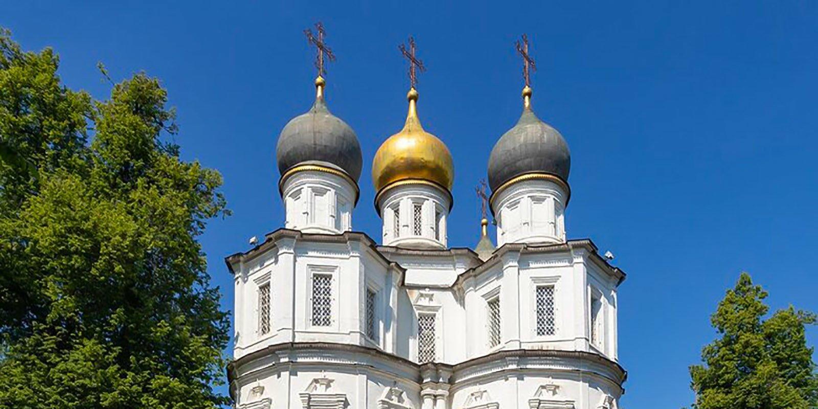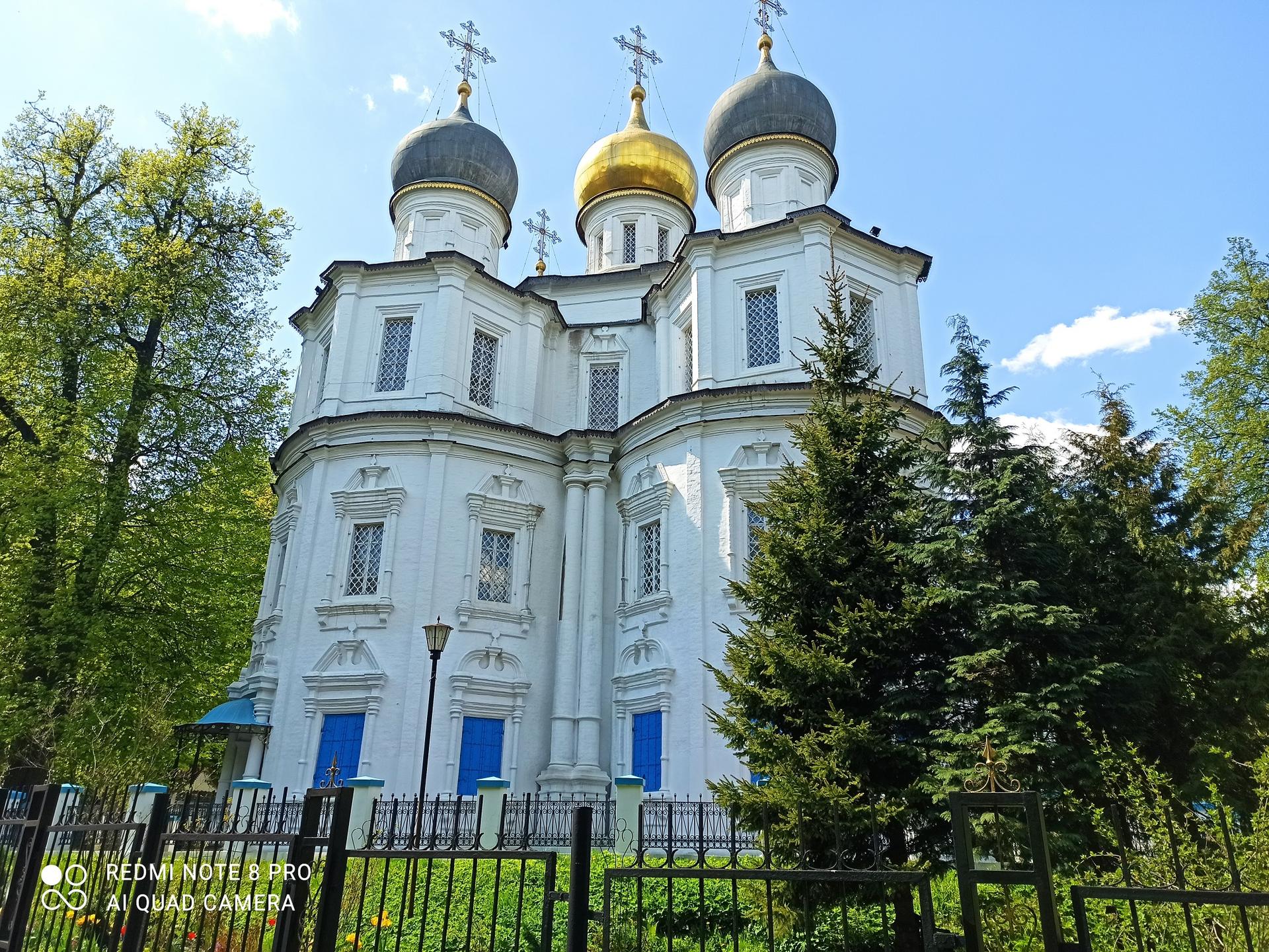 Пятиглавый храм в плане представляет собой крест. Четыре купола, ориентированные по сторонам света, возвышаются над полукружиями кирпичных побелённых стен. Центральный золочёный купол придаёт стройность силуэту храма. Необычно используется в качестве звонницы западный барабан, купол которого является резонатором звука. По преданию, с этой звонницы император Наполеон наблюдал за отступающей французской армией в 1812 году.