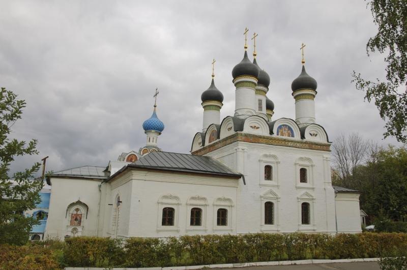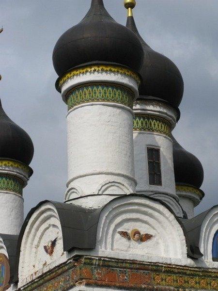 Храм был искусно украшен поясом цветных изразцов по карнизу, над карнизом полукруглые закомары украшены яркими изразцовыми изображениями херувимов. Их синие крылья и головы резко выделяются на фоне побелки, придавая дополнительную выразительность и нарядность верхней части храма. Первоначально изразцовые пояса украшали все пять глав храма. Последний ряд изразцов венчал верхние части барабанов под главами церкви, но до наших дней не сохранился. Именно нарядные изразцы придавали сравнительно скромному храму изысканную нарядность: на зеленом фоне выделяются геометрические изображения, похожие на соцветия, покрашенные в желтые, синие, белые тона… Появление изразцов на фасадах храма не случайно: Б. М. Хитрово возглавлял Оружейную палату, где в то время работали «мастера ценинного дела», приглашенные им для работы.
