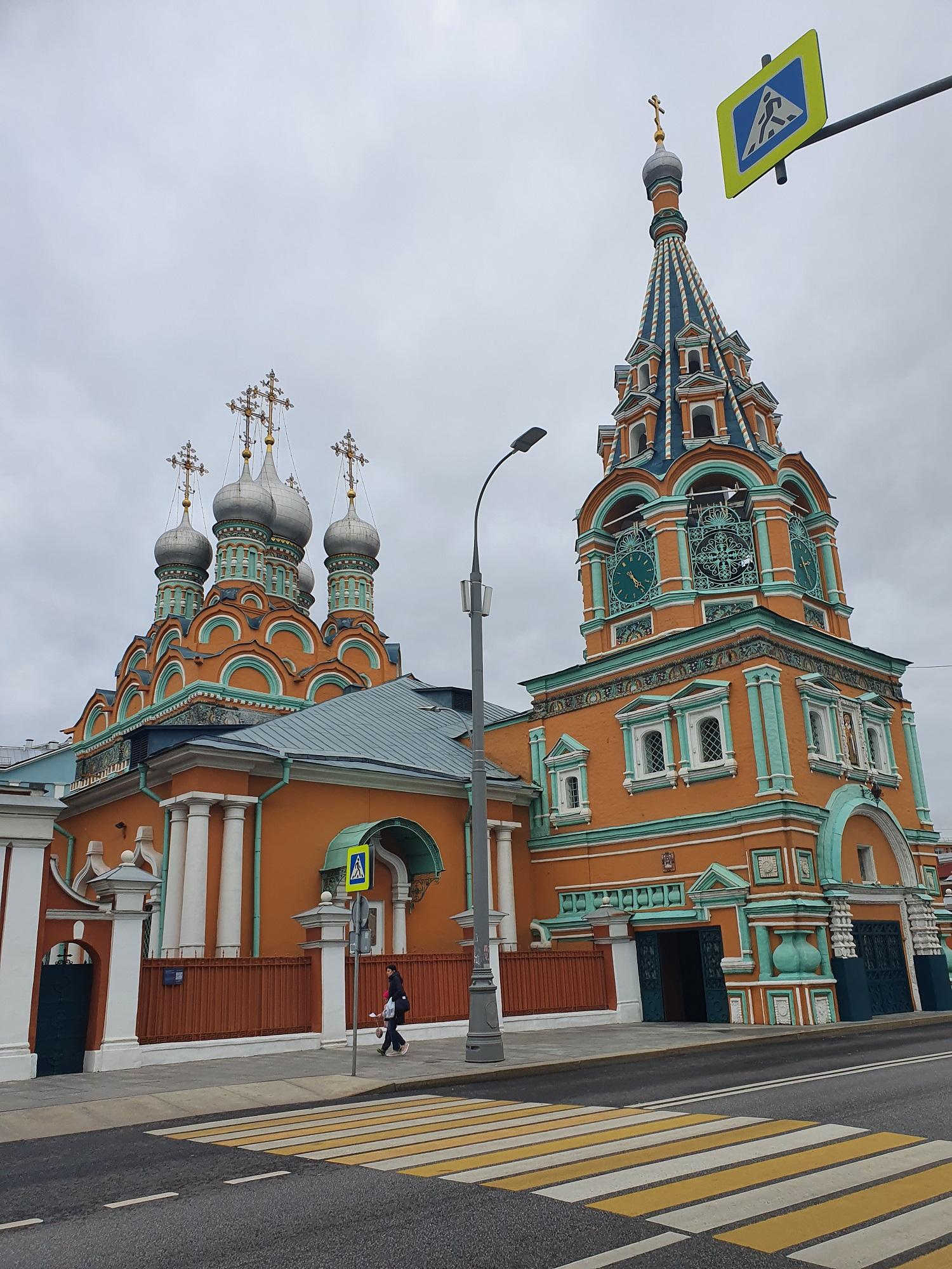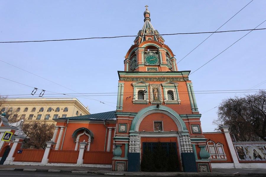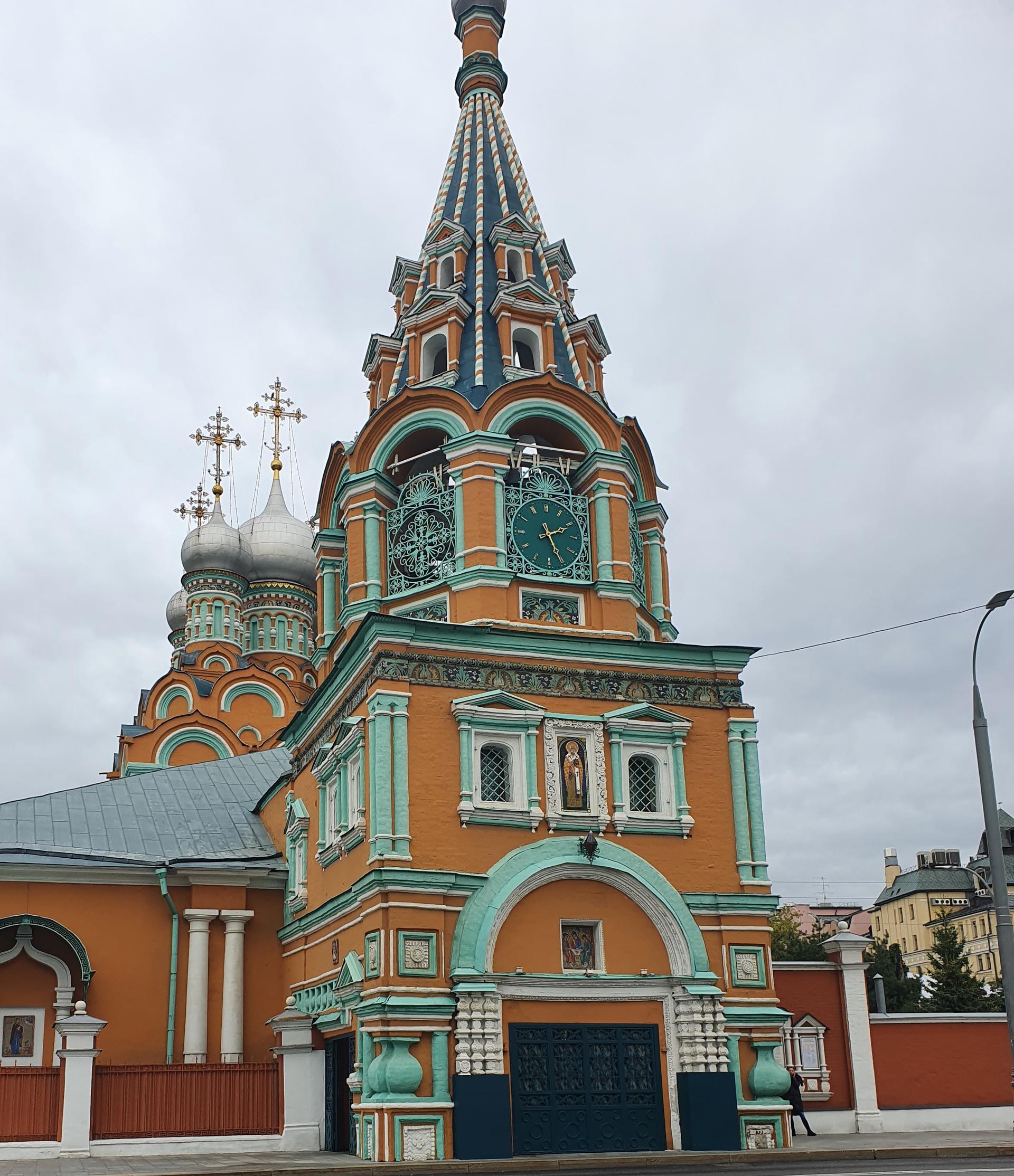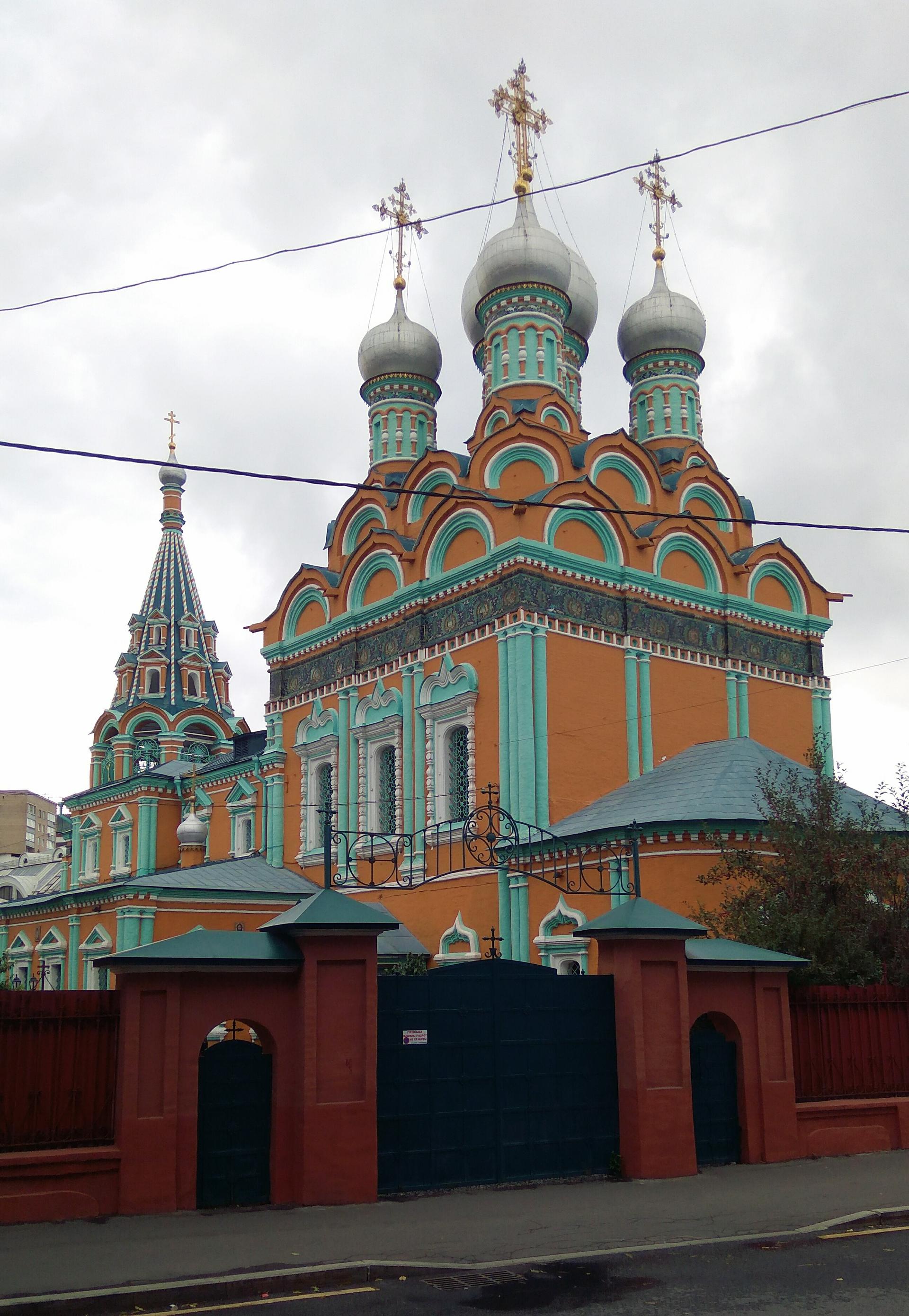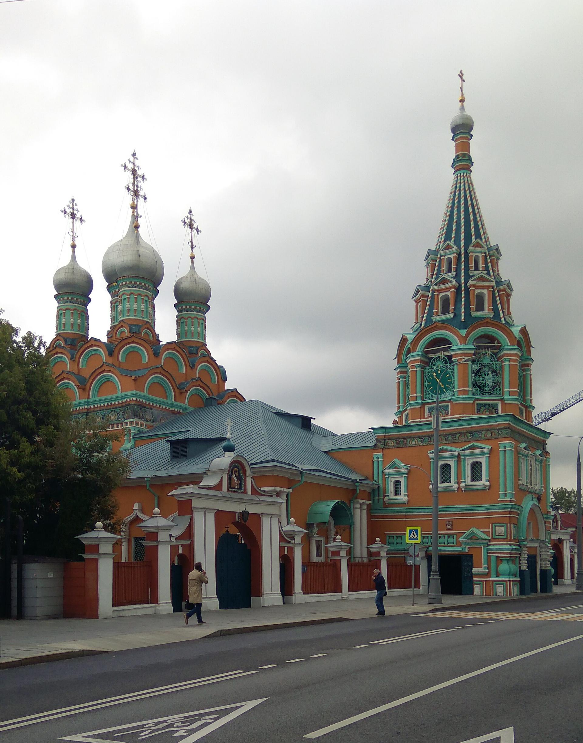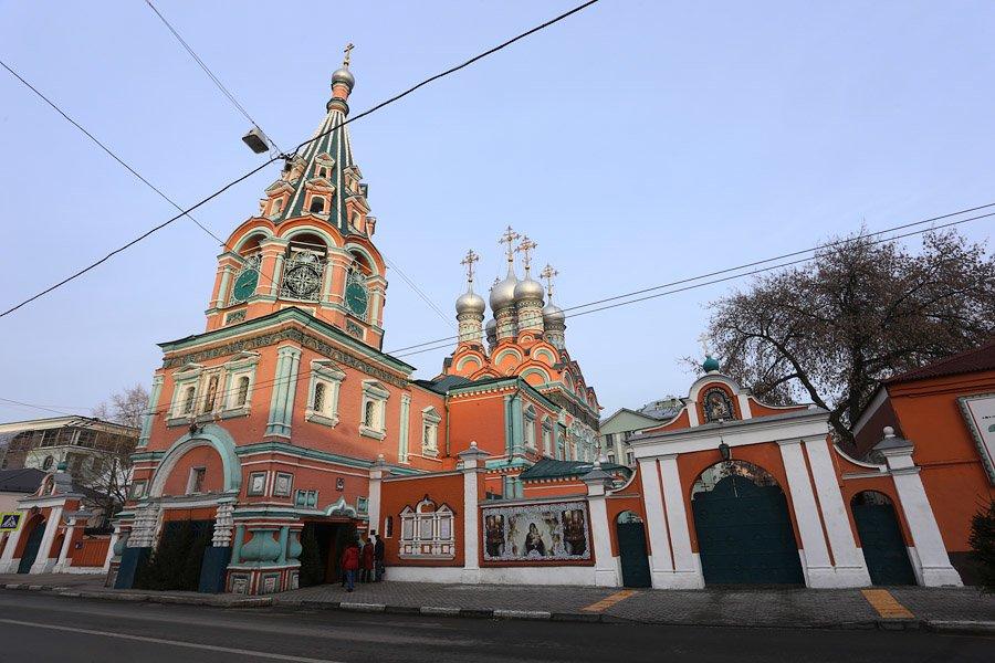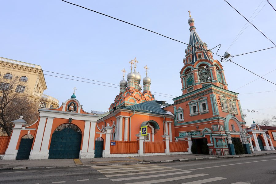 Яркий, охряный, украшенный премудрыми узорами храм Св. Григория Неокесарийского построен в середине XVII века. Находится на Большой Полянке (знаменитой своими купеческими особнячками замоскворецкой улице), недалеко от станции метро "Полянка". Храм состоит из трех основных частей: шатровая колокольня соединяется трапезной с четвериком, увенчанным горкой кокошников и пятиглавием. Красивейшие декоративные убранства - белокаменные и кирпичные фигурные детали - наличники, порталы, карнизы. Фасады колокольни и четверика обрамлены поясом из девяти тысяч многоцветных изразцов рисунка "павлинье око" автора Степана Иванова по прозвищу Полубес.