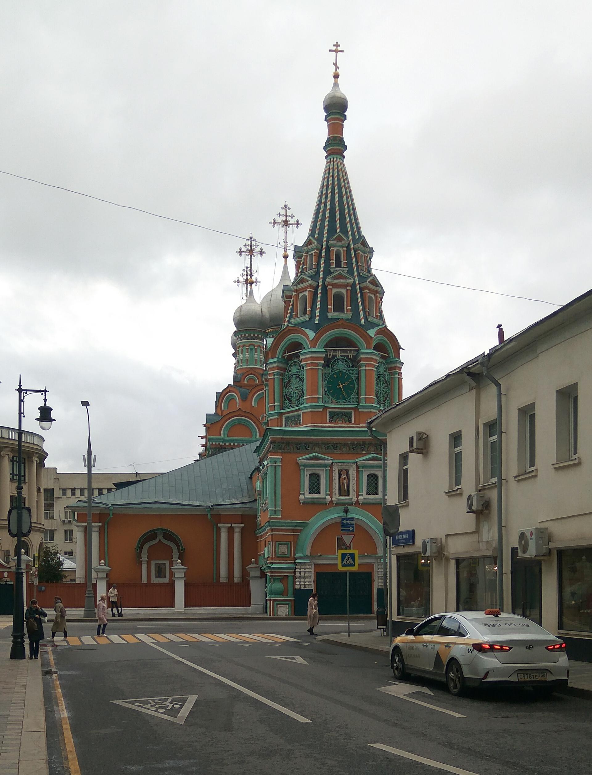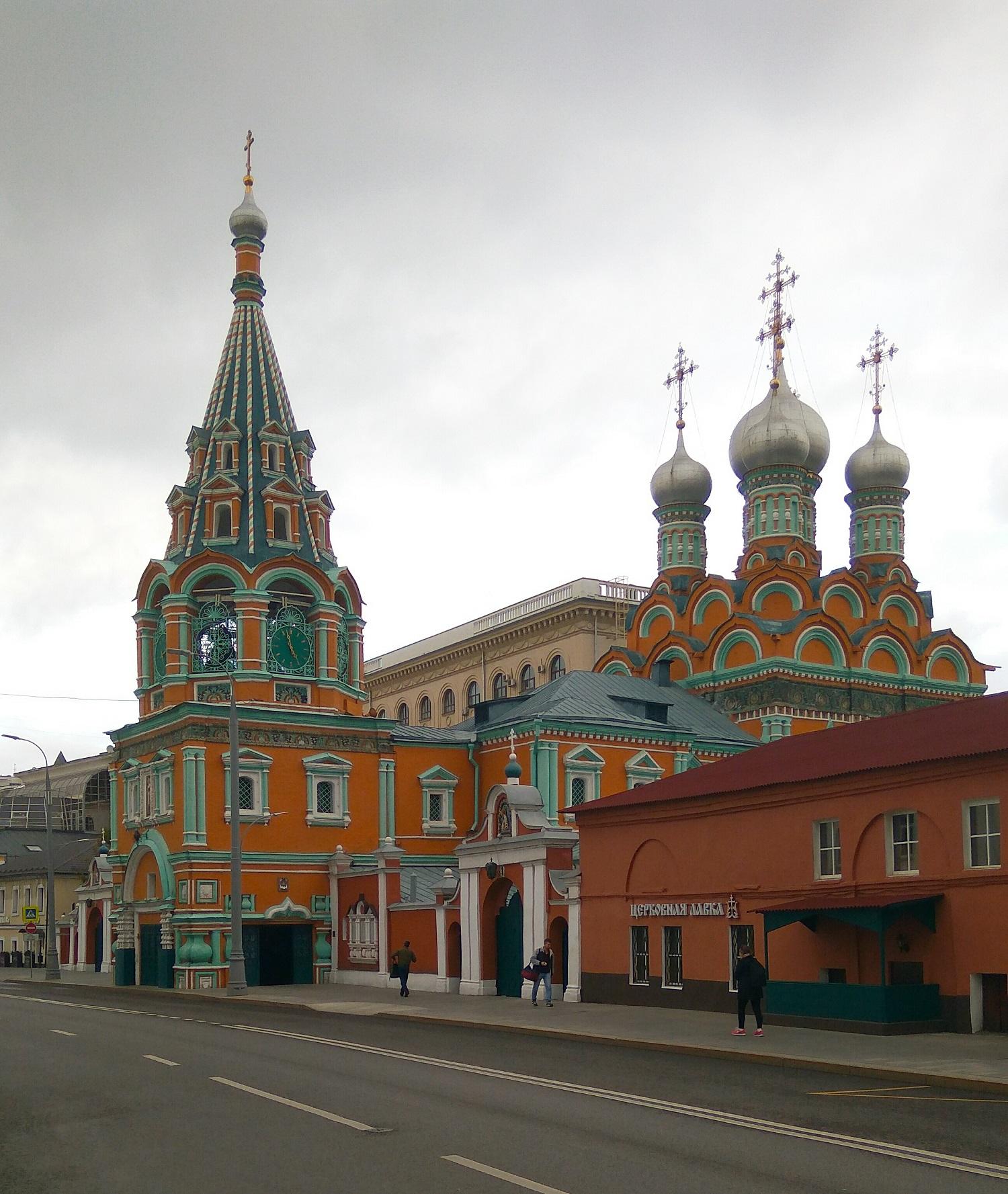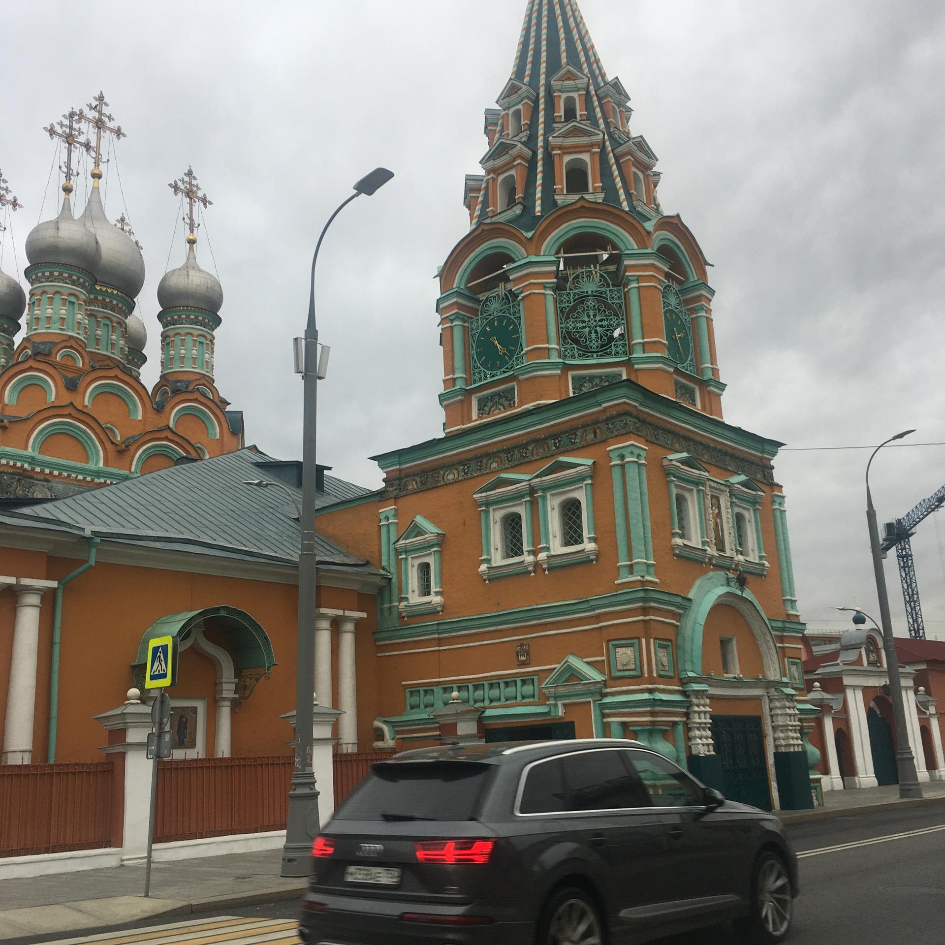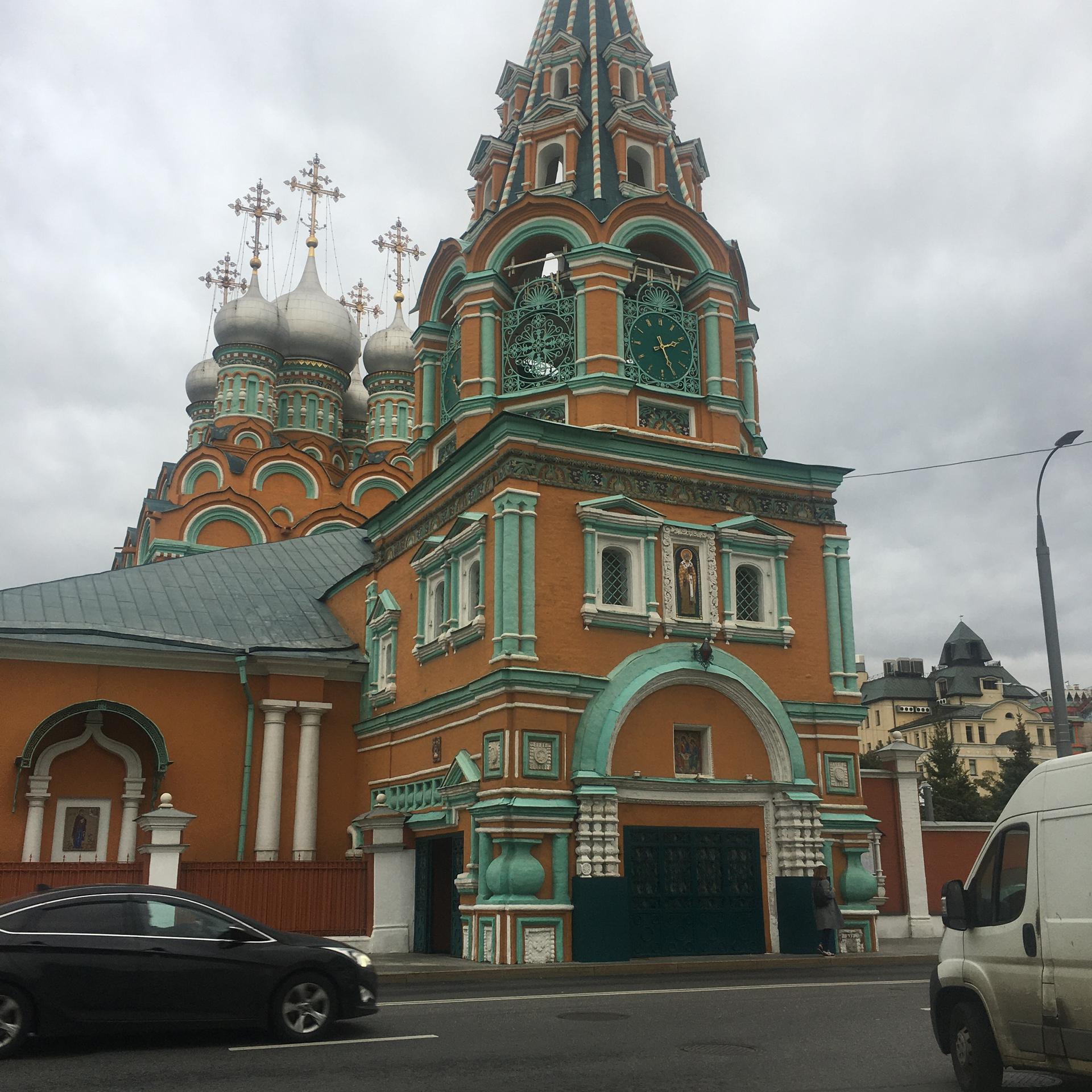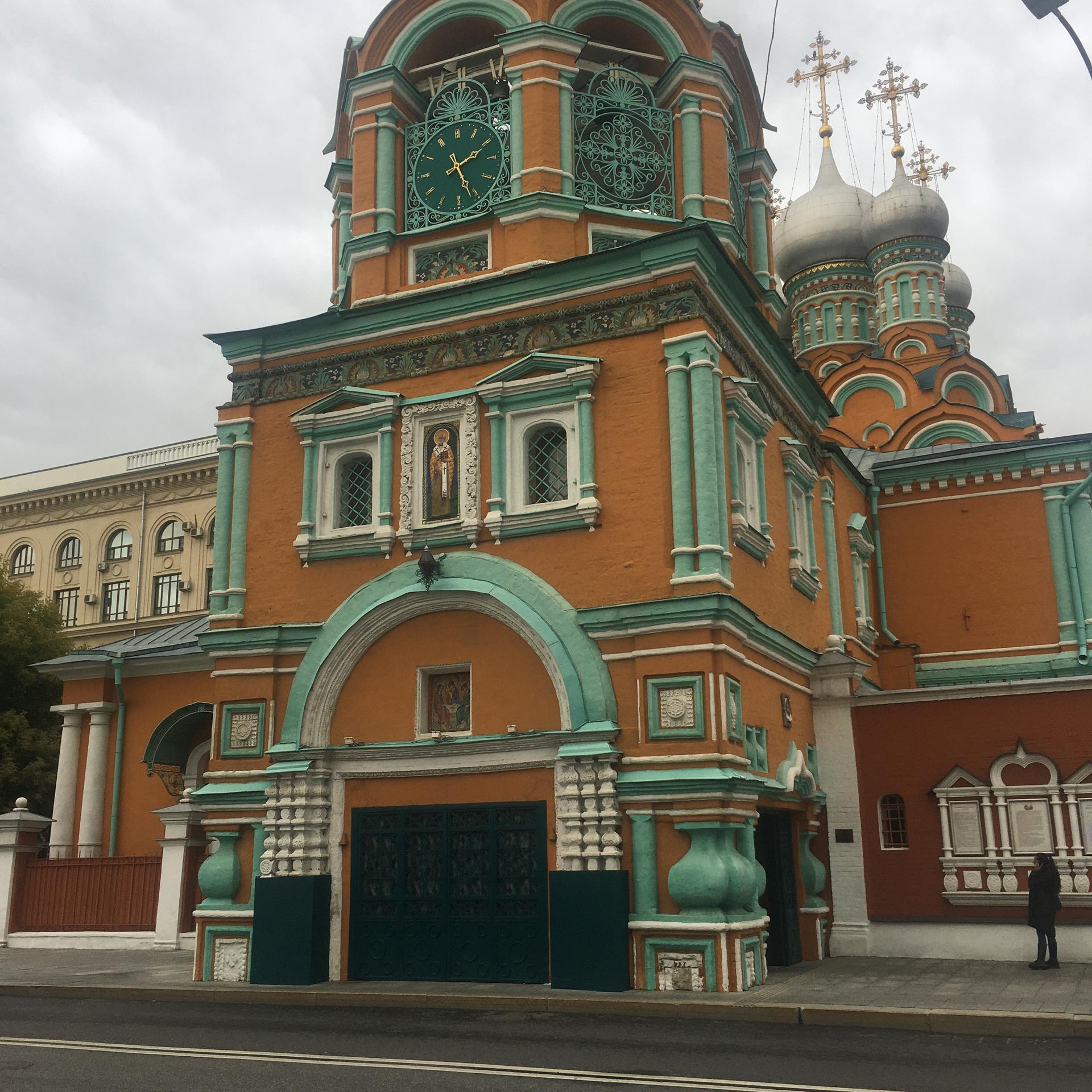 Яркий, охряный, украшенный премудрыми узорами храм Св. Григория Неокесарийского построен в середине XVII века. Находится на Большой Полянке (знаменитой своими купеческими особнячками замоскворецкой улице), недалеко от станции метро "Полянка". Храм состоит из трех основных частей: шатровая колокольня соединяется трапезной с четвериком, увенчанным горкой кокошников и пятиглавием. Красивейшие декоративные убранства - белокаменные и кирпичные фигурные детали - наличники, порталы, карнизы. Фасады колокольни и четверика обрамлены поясом из девяти тысяч многоцветных изразцов рисунка "павлинье око" автора Степана Иванова по прозвищу Полубес.