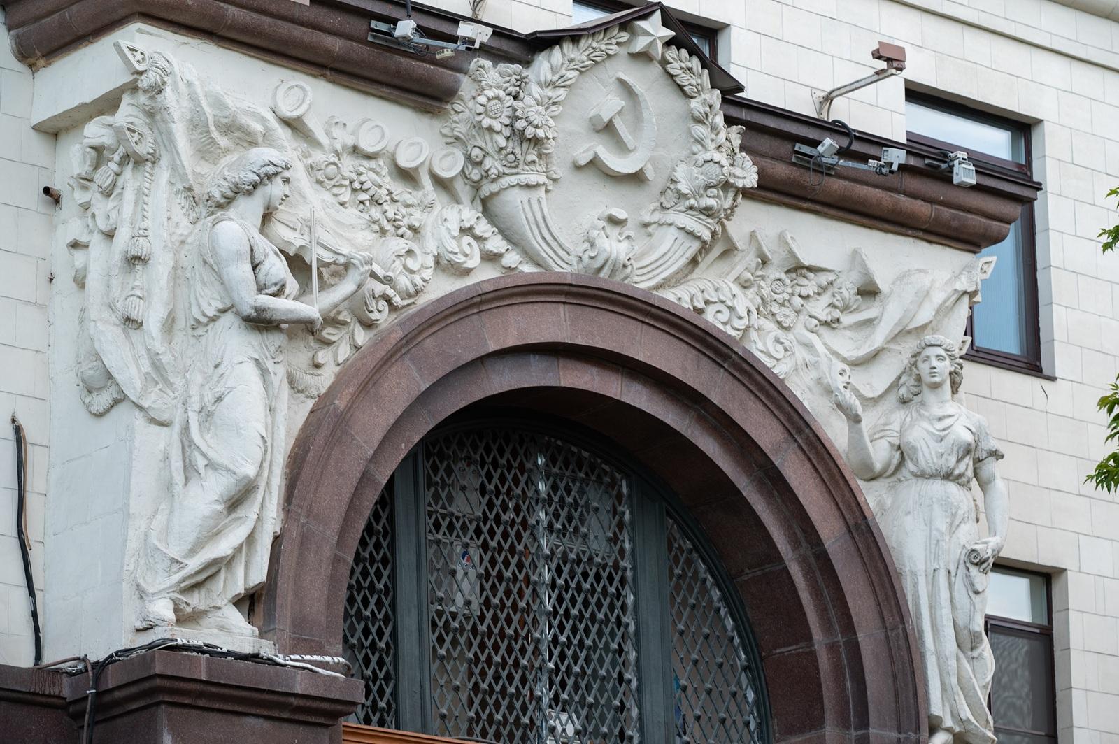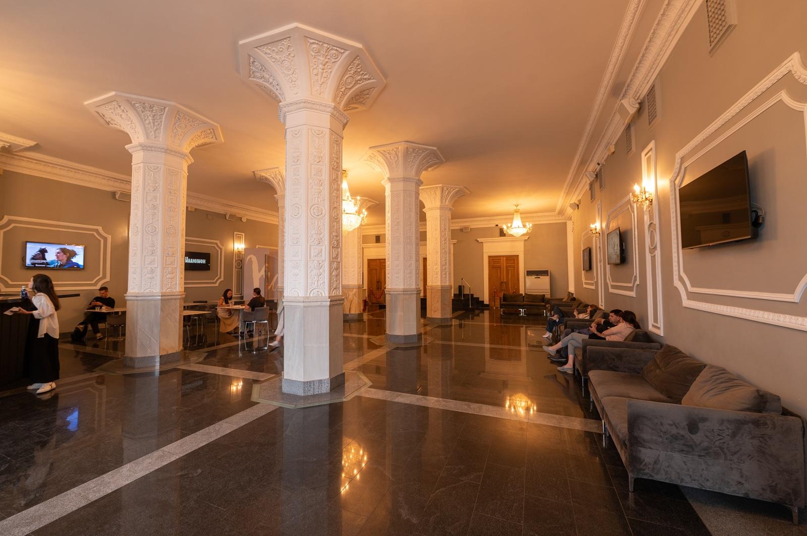 В интерьерах кинотеатра, расположенного в третьей по высоте сталинской высотке, сохранились ключевые элементы аутентичного декора ушедшей эпохи: массивные хрустальные люстры в стиле ар-деко, резные колонны, лепнина на стенах.
