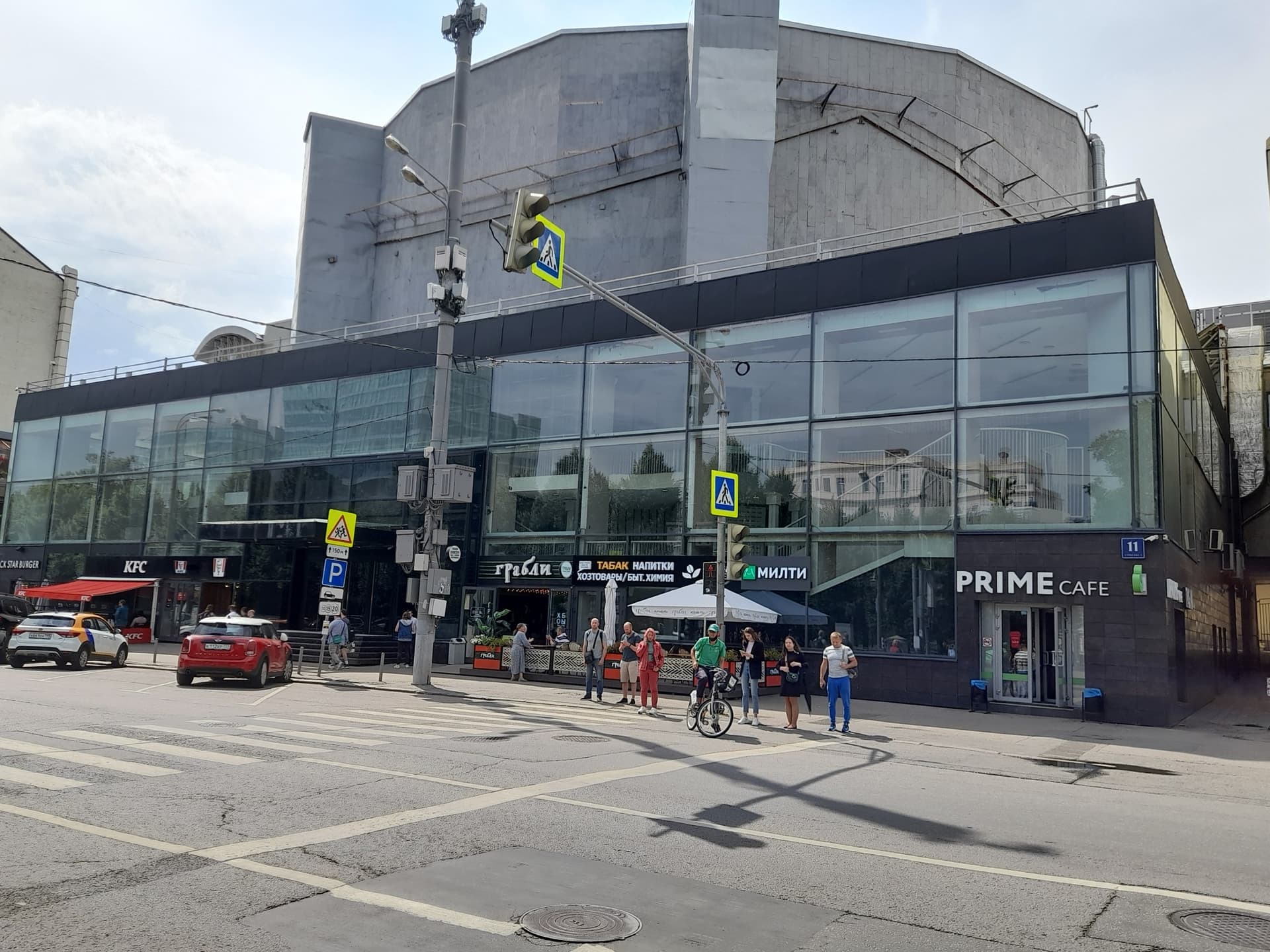 В нем был громадный экран, на который выводилось изображение с некоторых проекторов. Экран был большим в мире – дуга 146 градусов размером 33 на 12 метров. Кресла располагались под большим углом и было видно хорошо со всех сторон. Стоимость билетов была разная – в центре 70 копеек, по краям 50 копеек. В кинотеатре показывалась советские фильмы «Широка страна моя», «Течет Волга», «Повесть пламенных лет», «Опасные повороты». Позднее экран был заменен на плоский и меньшего размера и в 1960 году кинотеатр был переоборудован в широкоформатный с залом на 1220 мест. Контраст стекла и глухих поверхностей придавал выразительность зданию.