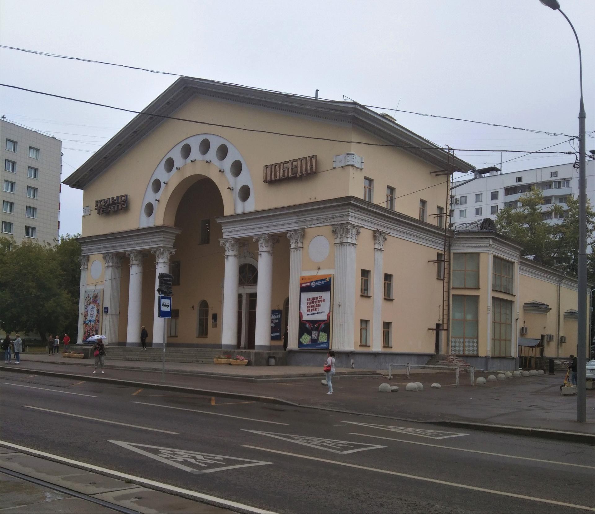 Кинотеатр «Победа» – это один из трех типовых кинотеатров, построенных в Москве во второй половине 1950‑х по проекту заслуженного архитектора СССР Ивана Владиславовича Жолтовского. На фоне панельной застройки Абельмановской улицы здание «Победы» смотрится дворцом. За основу для проекта архитектор действительно взял дворец – виллу Пойана архитектора Палладио XVI века. Прямоугольная форма, арочный вход, украшенный по бокам колоннами, над аркой полукругом идут круглые отверстия – всё это можно увидеть и на вилле Пойана.