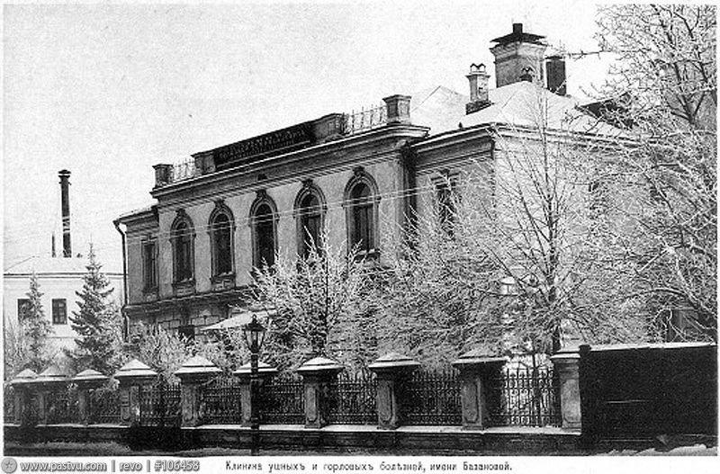 Клиника ушных, горловых и носовых болезней на углу Олсуфьевского и Боженинского переулков (нынешняя ул. Россолимо) была открыта при медицинском факультете Императорского Московского университета 22 октября 1896 г. Она входила в состав Клинического городка на Девичьем поле, хоть и располагалась в стороне от Большой Пироговской улицы.