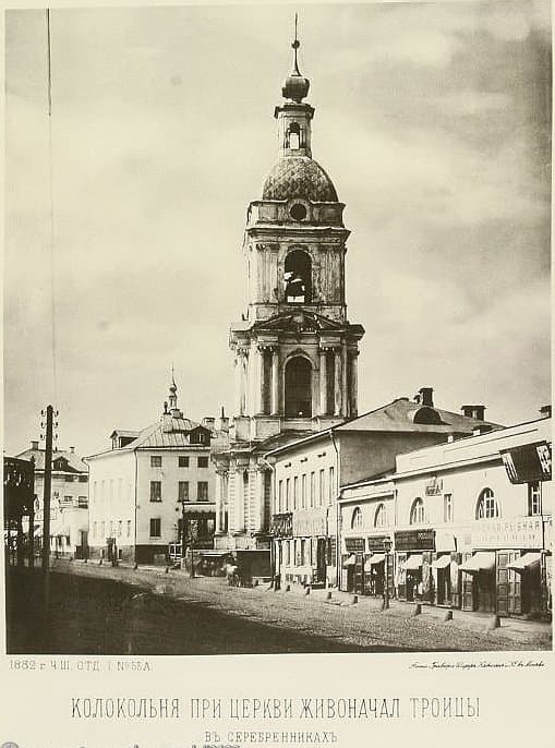 Деревянный храм во имя святой Троицы, по предположениям исследователей, существовал еще в XVI веке, но в источниках он впервые упомянут в 1620 году. В этом же столетии здесь появляется Государев Денежный двор, на котором чеканилась серебряная монета. Вокруг проживали соответствующие мастера, именовавшиеся серебряниками – именно они, будучи основными прихожанами Троицкого храма, дали ему прозвание «в Серебряниках». На карте Москвы от этого поселения осталась Серебряническая набережная реки Яузы и одноименный переулок, в котором стоит церковь. В 1657 году она известна уже как каменная, но в дальнейшем здание еще несколько раз расширялось. В 1764–1768 годах на средства Афанасия Гончарова (прапрадеда Наталии Гончаровой – супруги А.С. Пушкина), чья усадьба рядом с церковью сохранилась до наших дней, возводится существующая колокольня. Наконец, в 1781 году супруга купца I гильдии Татьяна Суровщикова жертвует средства на новый храм, который тогда же возводится на подклете и с использованием части стен старого здания.