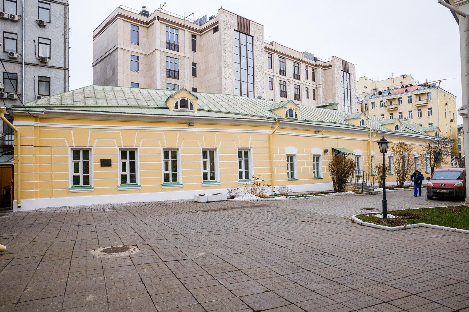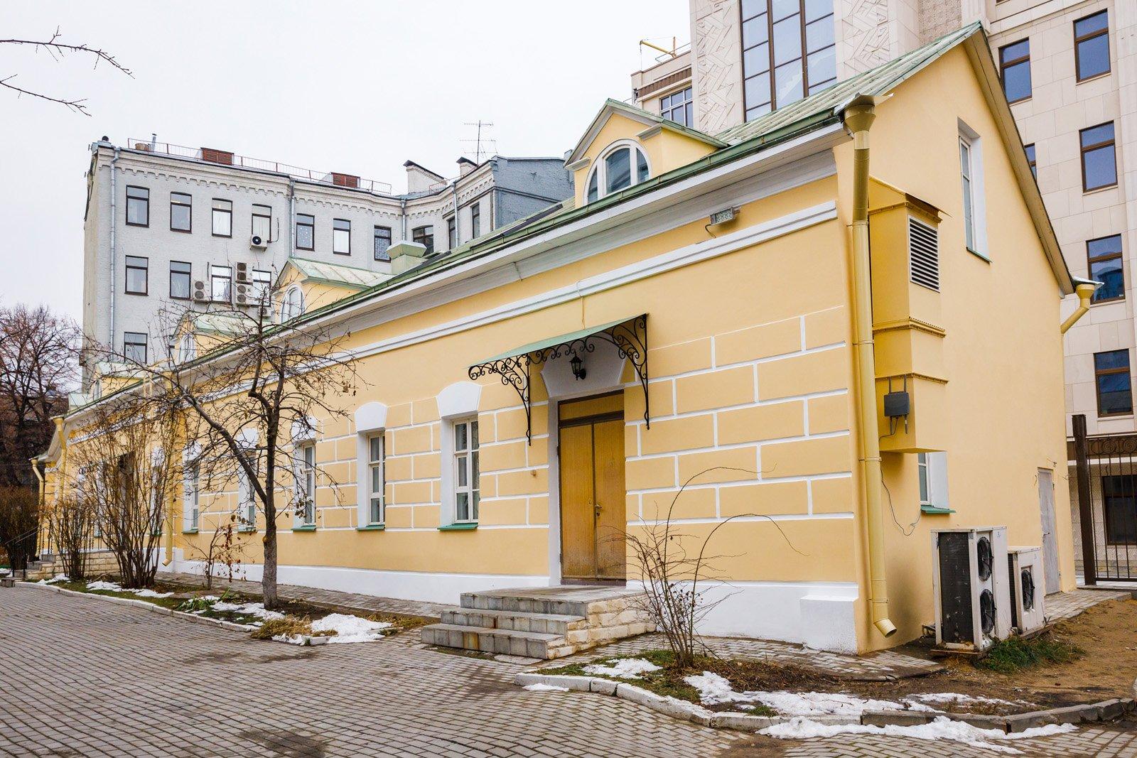 Здание усадебных служб находится в глубине участка Лопухиных, напротив двухэтажного жилого дома, существовавшего уже в 1816 году. Флигель вытянут практически на всю длину восточной границы владения. Торцевая северная часть дома была жилой, а в 1896 году по проекту архитектора А.Остроградского к ней было пристроено одноэтажное каменное строение на одну квартиру с кухней и входным тамбуром. Эта пристройка была выдержана в неоклассическом стиле, как и перестройка (в 1895 году) усадебного флигеля по Лопухинскому переулку С.У.Соловьевым. К 1950-м годам «пристройка Остроградского» была занята музеем Л.Н.Толстого. Она и сегодня сохраняет изначальный свой вид на 1896 год: отделана крупным штукатурным рустом, переплеты ее пяти окон имеют типичный для конца XIX века рисунок. Входной тамбур – очень маленький, не сомасштабен основному зданию и, как предполагают специалисты, скорее всего, он вообще не из проекта Остроградского, а был пристроен позднее.