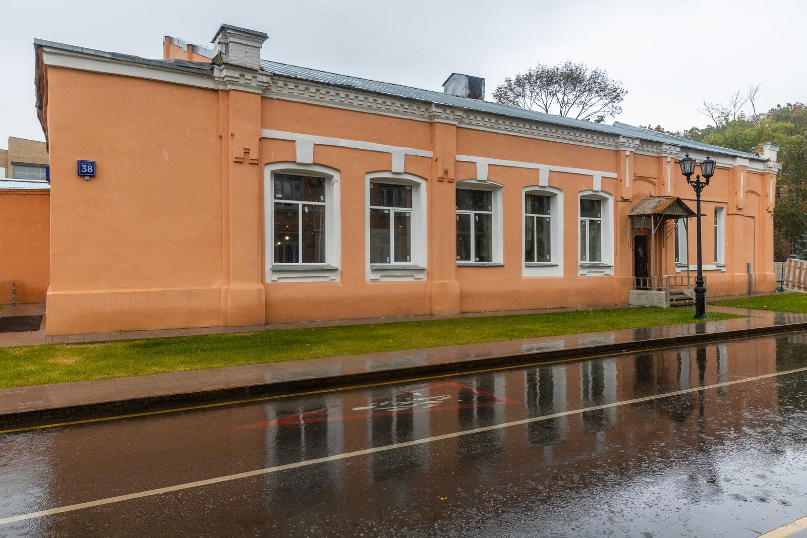 Центральное прясло шире остальных, что позволило разместить в нем тройное вертикальное окно. В остальных «нефах» окна одинарные. В верхней части центрального прясла-нефа размещена оригинальная изящная аркада. Композицию главного фасада оживляют два круглых окна (еще одна отсылка к готическим «прототипам») в соседних с центральным боковых пряслах-нефах. Интересен также ступенчатый карниз, тянущийся вдоль скошенной кровли здания.