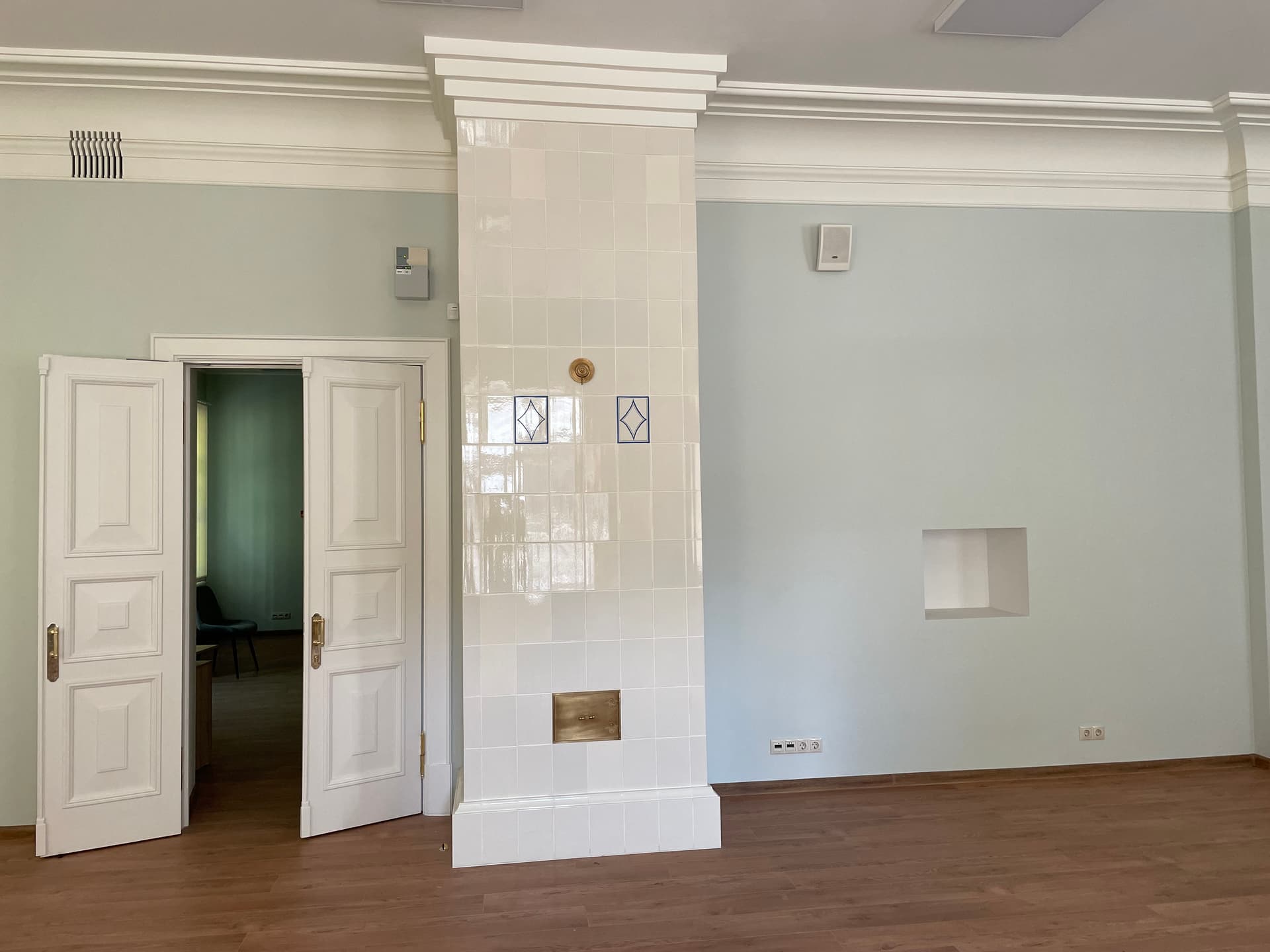Были также восстановлены столярные заполнения дверных проёмов и напольные покрытия из доломита и дубового паркета.
