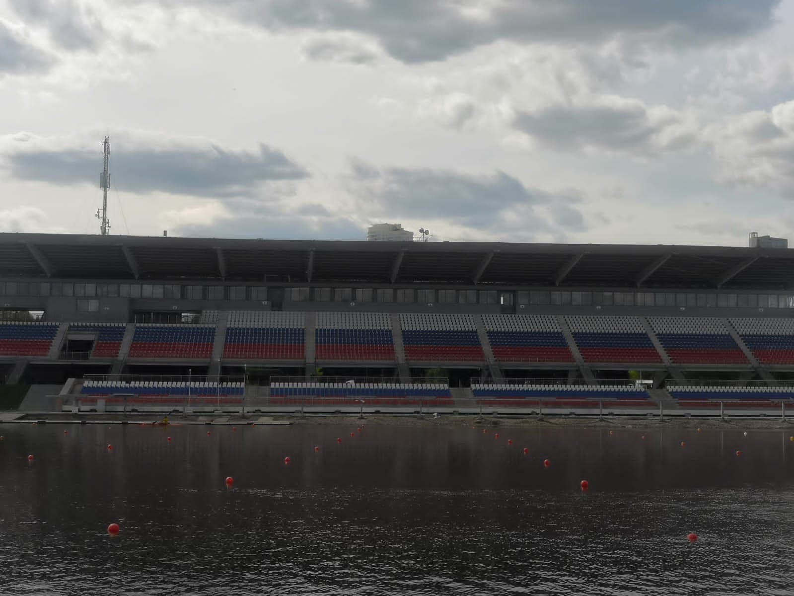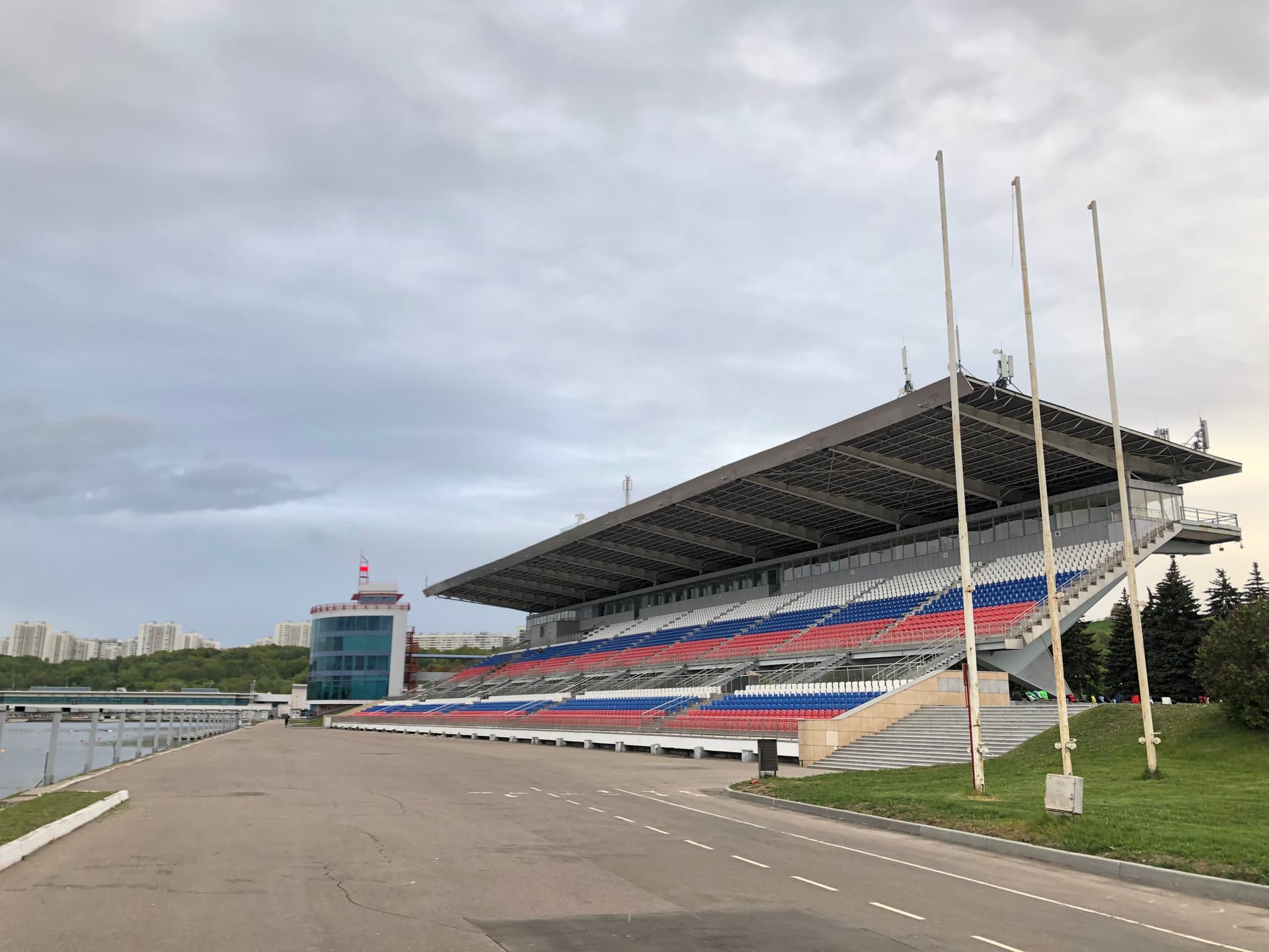 В финишной зоне сооружена уникальная с инженерной точки зрения крытая трибуна на 3400 мест с 18-метровым козырьком. Конструкция трибуны сзади опирается на консольные опорные ноги, спереди поддерживается стальными оттяжками, гребёнка посадочных рядов не касается земли, а само сооружение уравновешивает собственную нагрузку. Для обеспечения лучшего обзора трибуна развернута к трассе под углом 8°. На время Олимпиады-80 рядом устанавливались дополнительные временные трибуны, благодаря которым объект мог принять до 17 тысяч зрителей. Уровень воды в канале на четыре метра выше уровня реки, поэтому была разработана специальная система водозабора, спуска воды и очистные сооружения для предотвращения цветения.
