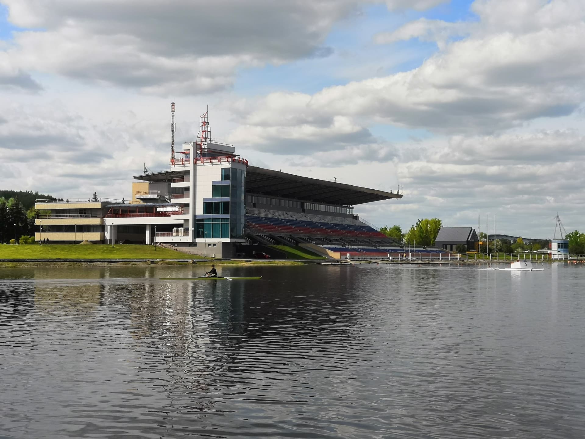В финишной зоне сооружена уникальная с инженерной точки зрения крытая трибуна на 3400 мест с 18-метровым козырьком. Конструкция трибуны сзади опирается на консольные опорные ноги, спереди поддерживается стальными оттяжками, гребёнка посадочных рядов не касается земли, а само сооружение уравновешивает собственную нагрузку. Для обеспечения лучшего обзора трибуна развернута к трассе под углом 8°. На время Олимпиады-80 рядом устанавливались дополнительные временные трибуны, благодаря которым объект мог принять до 17 тысяч зрителей. Уровень воды в канале на четыре метра выше уровня реки, поэтому была разработана специальная система водозабора, спуска воды и очистные сооружения для предотвращения цветения.