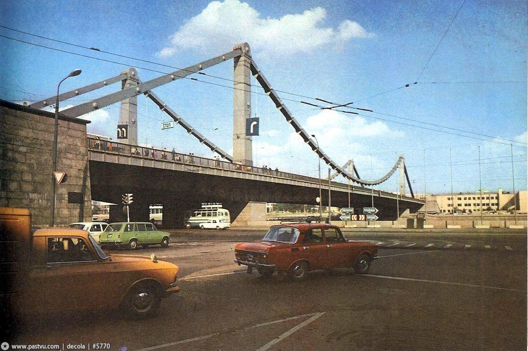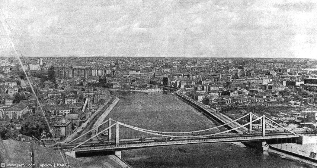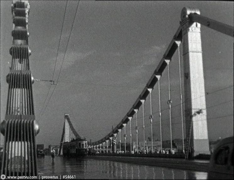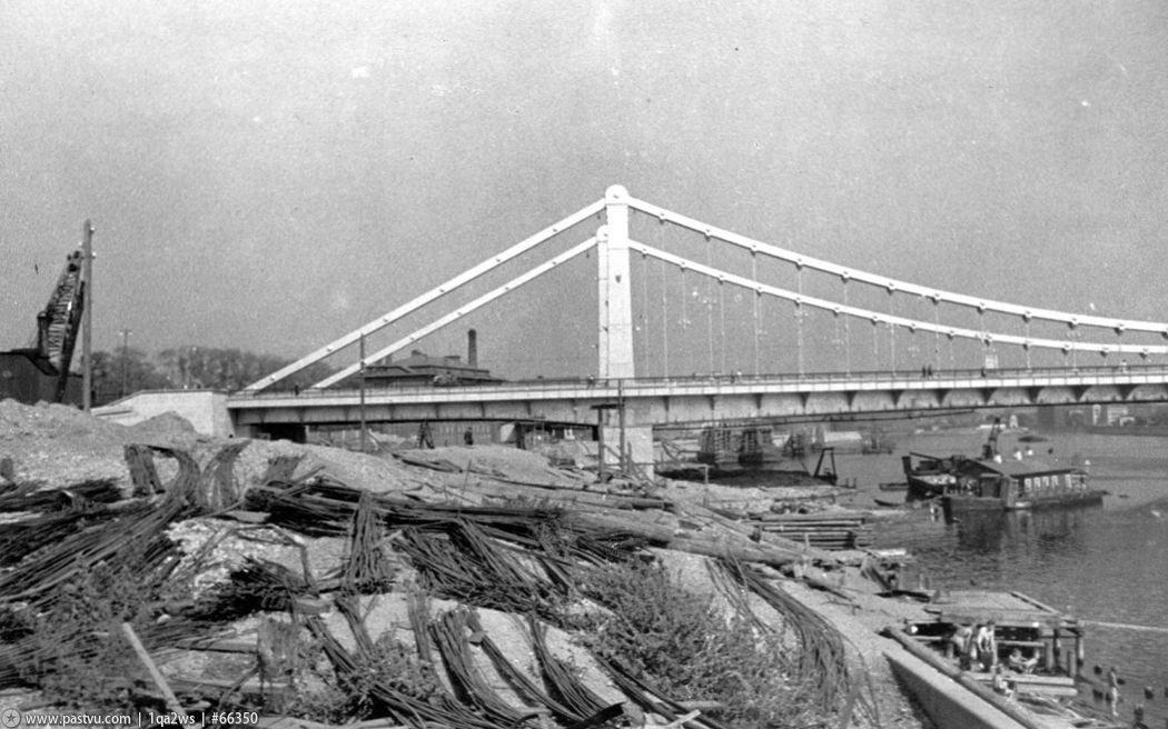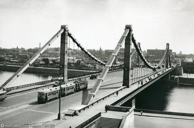 Построенный в 1936-1938 годах, взамен старого узкого моста (на самом деле он был четвертым на этом месте), соединявшего две дуги Садового Кольца, новый Крымский мост стал не только красивейшим на Москве-реке, но и первым подвесным в столице. В довоенное время это был крупнейший подвесной мост в Европе, созданный архитектором А.В. Власовым и инженером Б. П. Константиновым.
