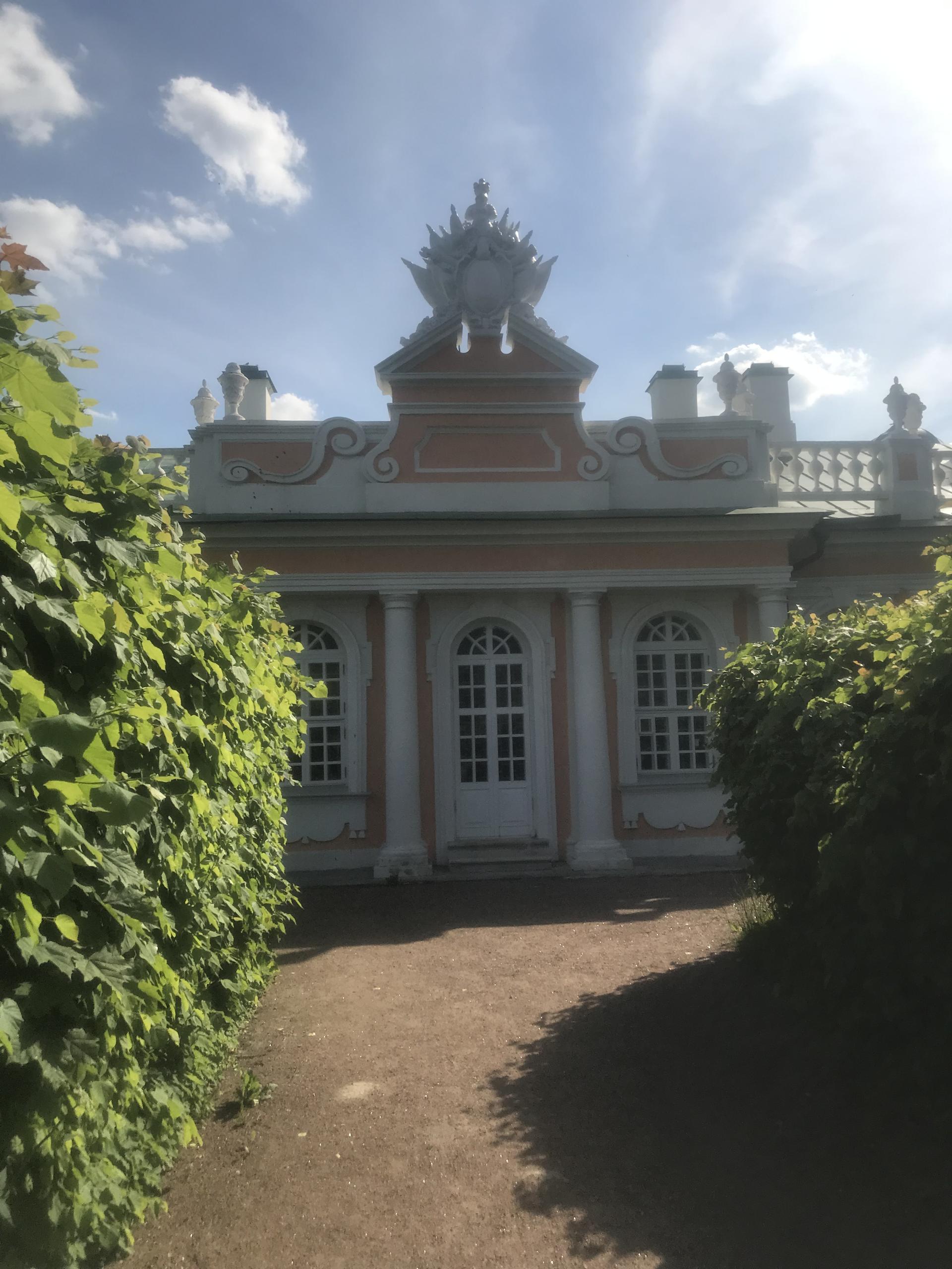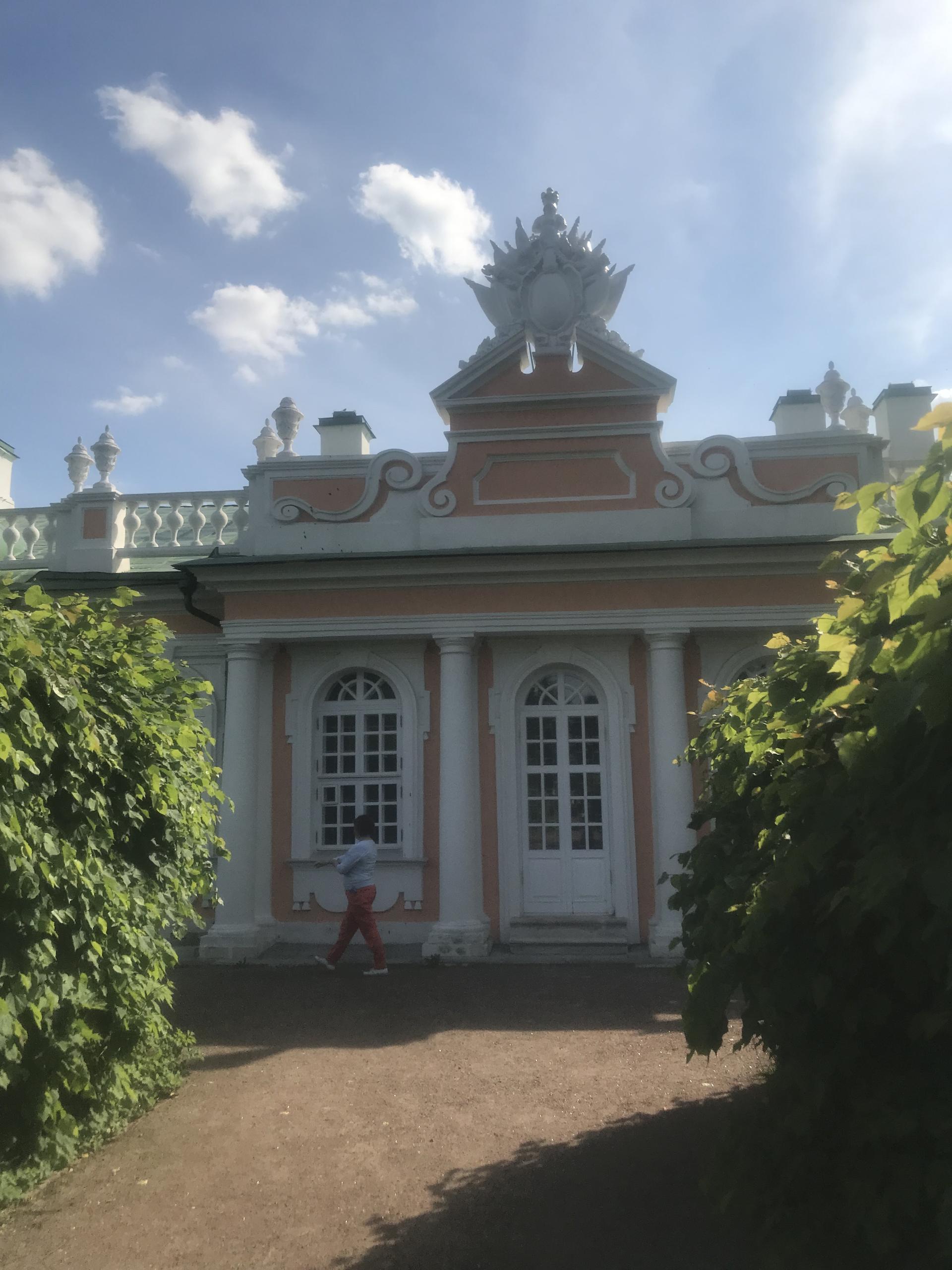 Во флигеле располагались русская и французская кухни, скатертная и хлебная, нечто вроде кондитерского цеха (хлебная и кондитерская - разные вещи, а не одно и то же!) , а также кофейная. Строили здание в едином со всем ансамблем стиле: северный и южный фасады украшены колоннадой, высокими арочными окнами, сверху здание венчает балюстрада с вазонами и картушами. Фасад строения, как и самого дворца, выходит на Большой пруд, тем самым формируя живописный вид Почетного двора.