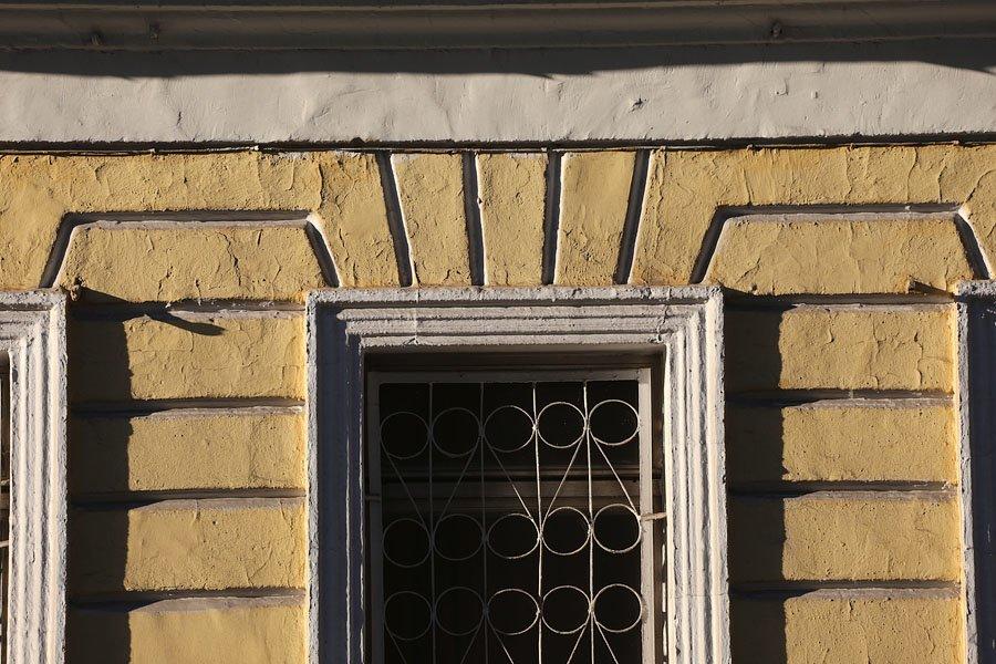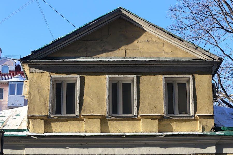 Незатейливый декор этого дома делает его неброским памятником старины. Домик в семь окон по фасаду, с очень милым мезонином в три окна. Окна первого и второго этажа имеют профилированные простые наличники. Центр композиции — три окна выделены рустом и имитацией замковых камней над окнами.