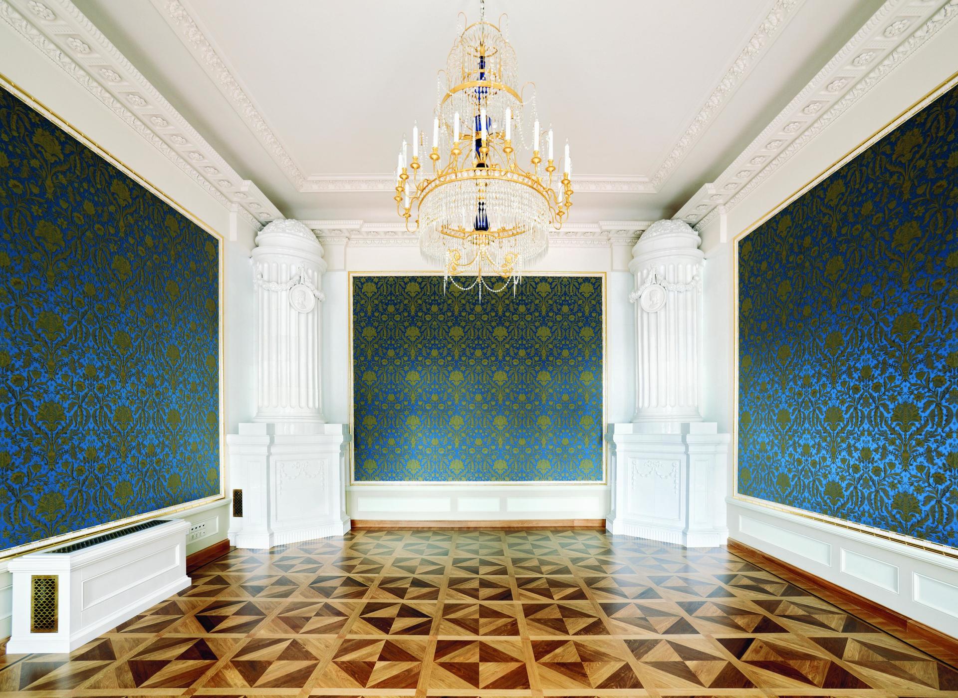 Четыре исторических зала второго этажа в соответствии с архивными данными были затянуты штофом разных цветов – золотым, малиновым, голубым, зеленым – с рисунком, подобранным по аналогам исторических тканей конца XVIII века.