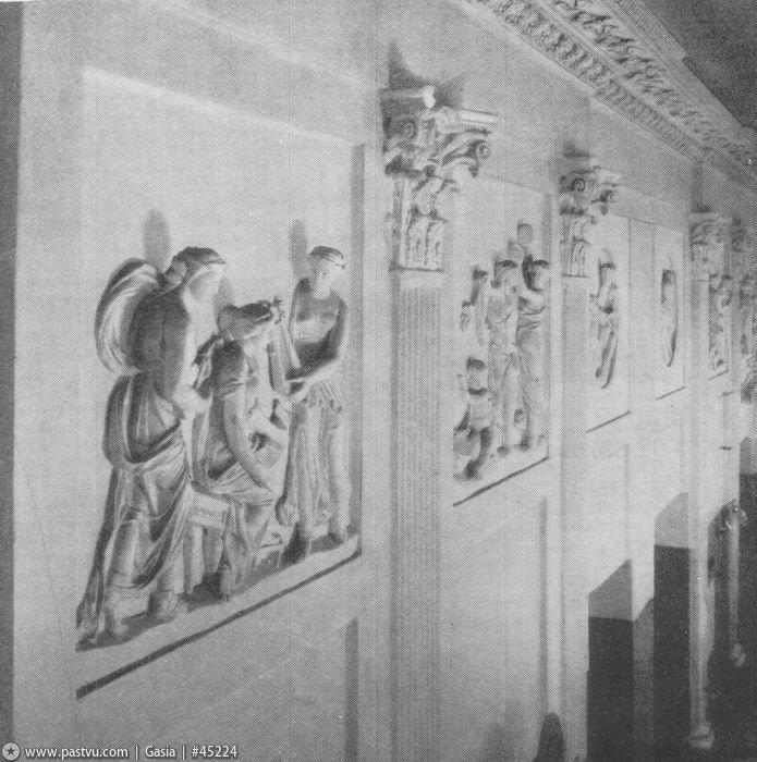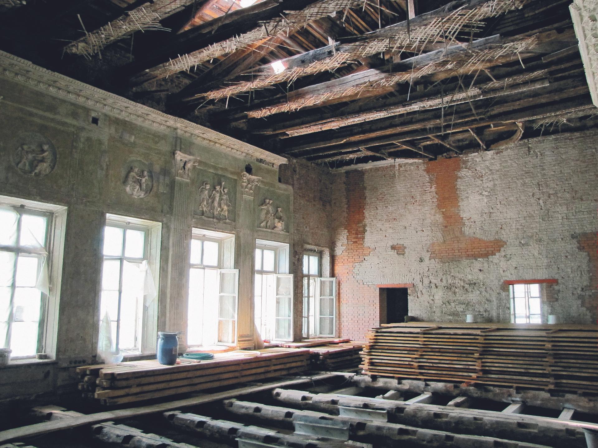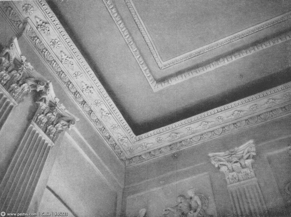 В результате исследований плафона в парадном зале обнаружены фрагменты живописи плохой сохранности. Живопись было решено восстановить по утвержденному эскизу.