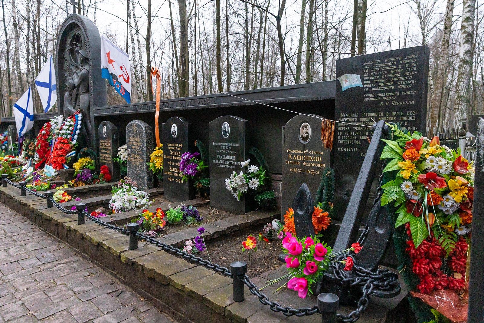 Слева от главного входа – монумент в форме подводной лодки. Это памятник морякам, погибшим 4 июля 1961 года при ликвидации аварии атомного реактора на подводной лодке К-19 во время учений в Северной Атлантике. Из-за течи в системе охлаждения реактор нагрелся до критических величин, возникла угроза взрыва. Члены экипажа вошли в реакторный отсек и, получив смертельную дозу облучения, предотвратили взрыв, собрав участок трубопровода, дублирующий поврежденный.