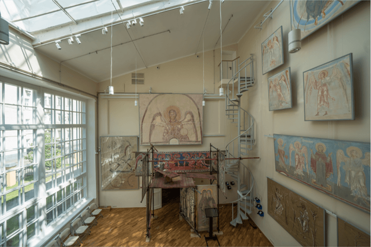 В жилой части отреставрировали историческую деревянную лестницу, потолочные карнизы и паркет. Особое внимание уделили восстановлению первоначальной планировки мастерской и её приспособлению под нужды иконотеки А.Н. Овчинникова.