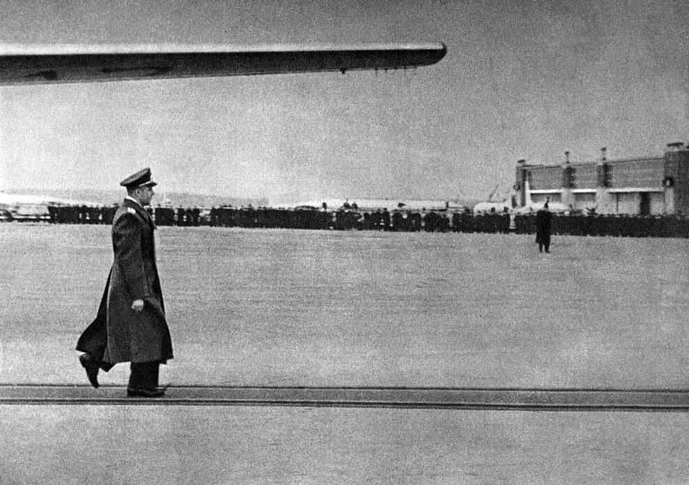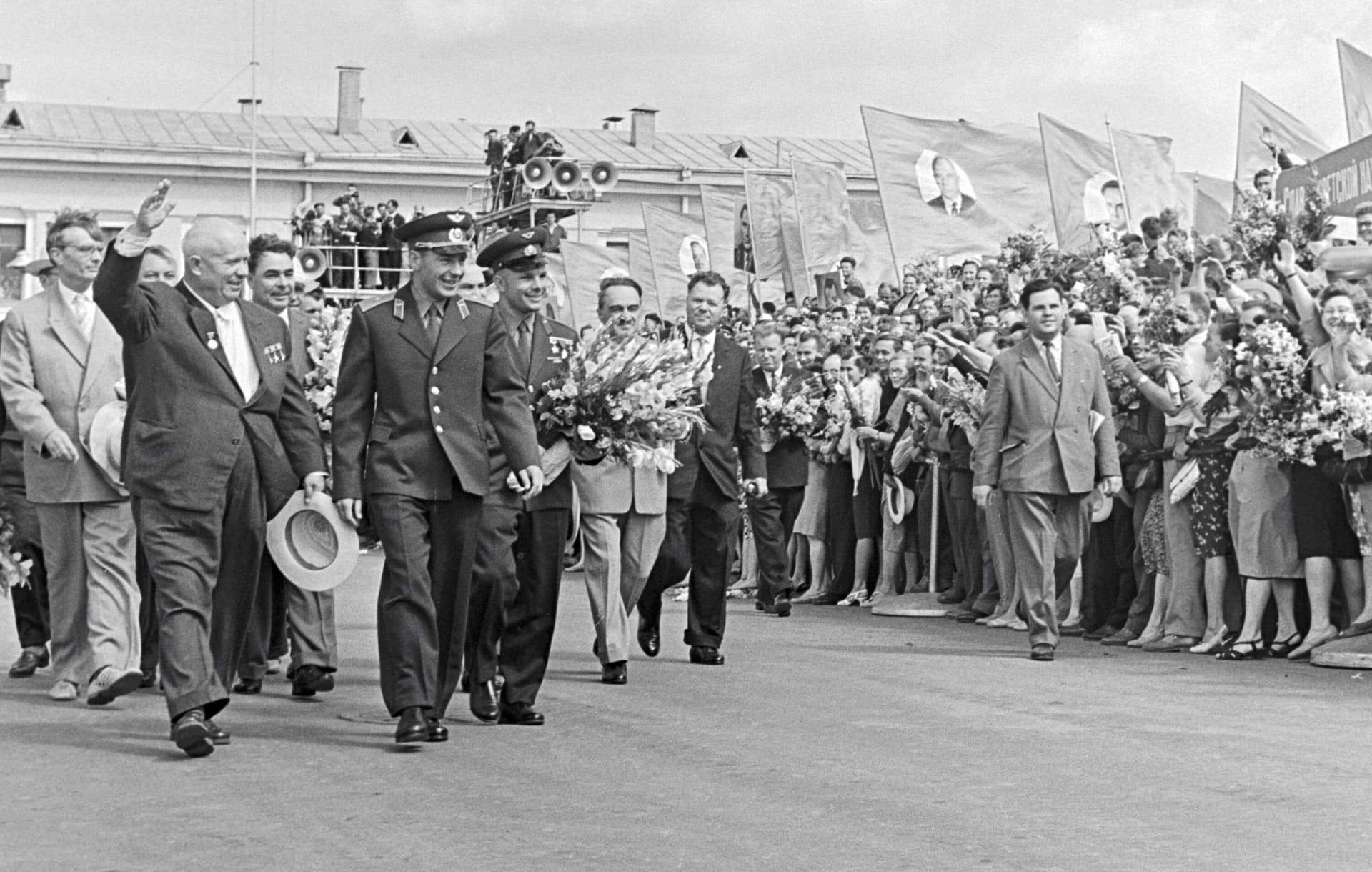12 апреля 1961 года на орбиту впервые в истории отправляют человека – Юрия Алексеевича Гагарина. Первых космонавтов неизменно встречали в аэропорту Внуково: торжественная церемония, трибуна официальной делегации, красная дорожка и ликующая толпа с праздничными плакатами. И, конечно, первая встреча с семьёй: первые объятия супругов после разлуки, счастливые дети, родители, дождавшиеся не просто своих героев – героев страны.