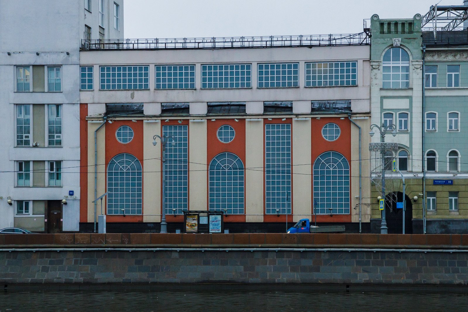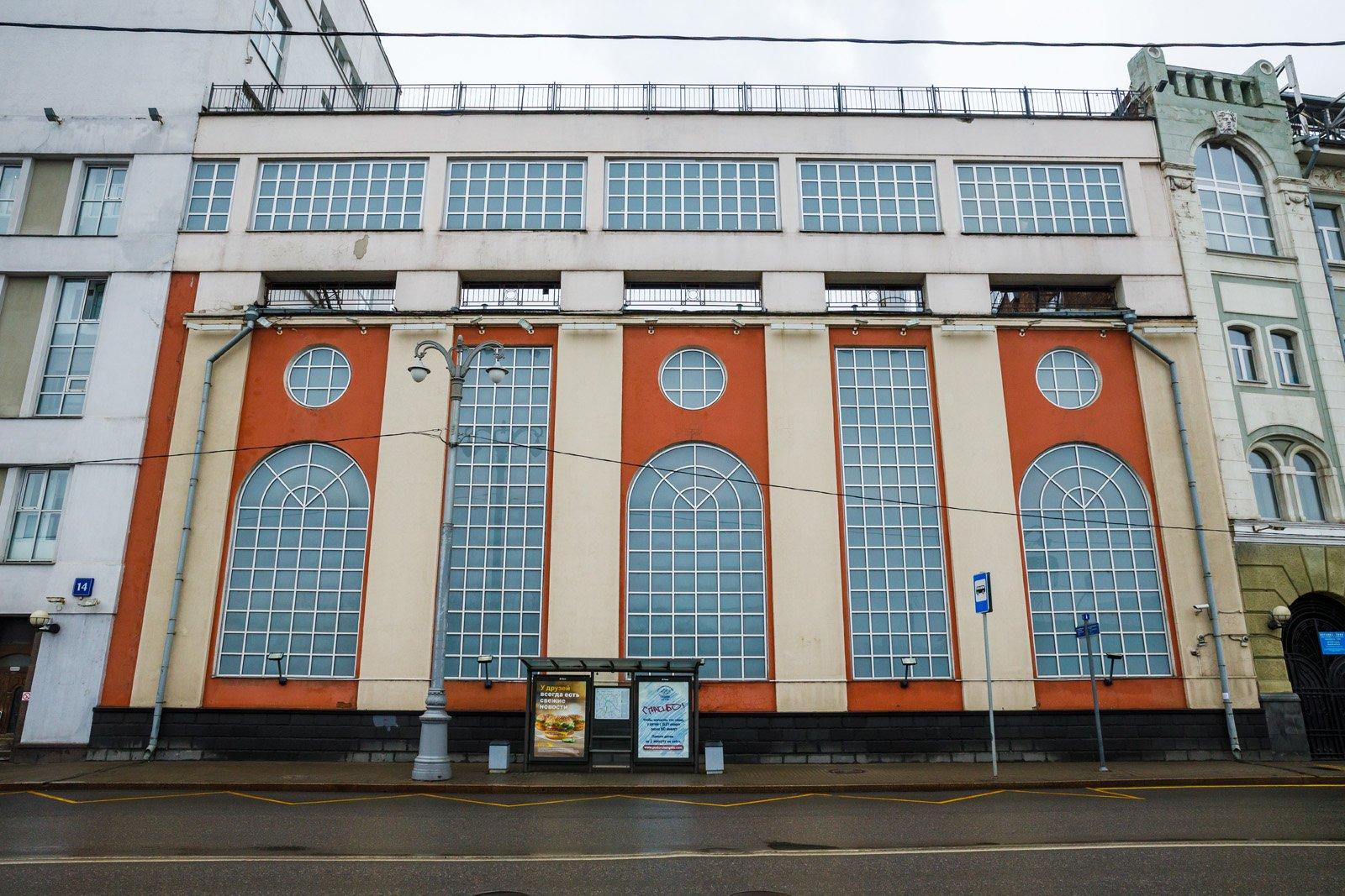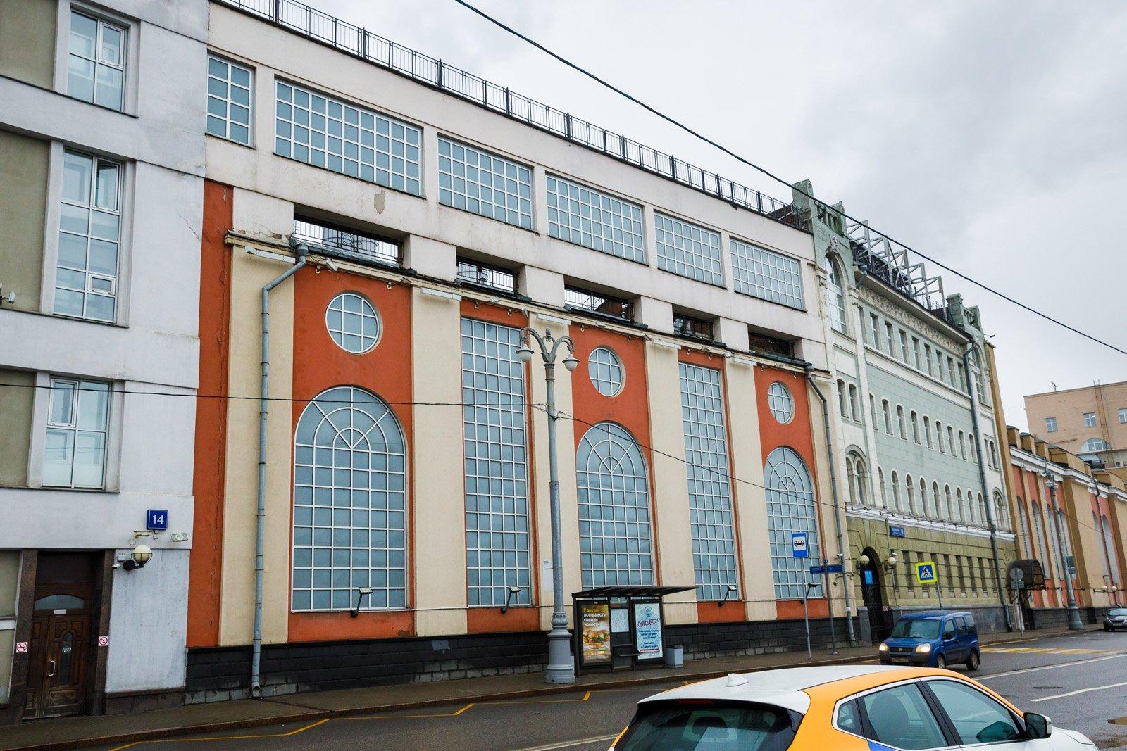 Он расчленен на всю высоту лопатками, которые выше карниза продолжают столбы аттика. Фасадный ритм создают чередующиеся вытянутые по вертикали витражи (плоскости сплошного остекления) и расположенные по одной оси круглые и арочные оконные проемы с металлическим витражным заполнением. Дворовый фасад, ныне частично скрытый поздними пристройками, полностью повторял главный. Он сохранил лопатки на углах, а также карниз и часть западного фронтона, фасад фермы галереи. Торцевой фасад (ныне скрыт домом № 14) имел по центру более широкий арочный проем, фланкированныий узкими арочными же проемами с тремя круглыми окнами над ними.