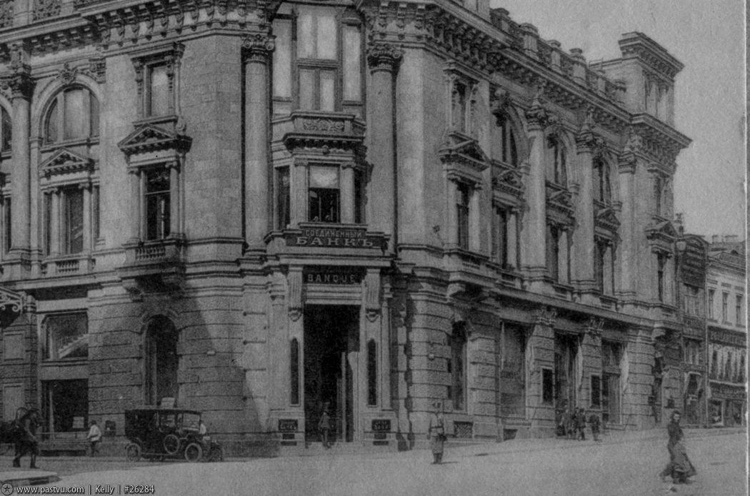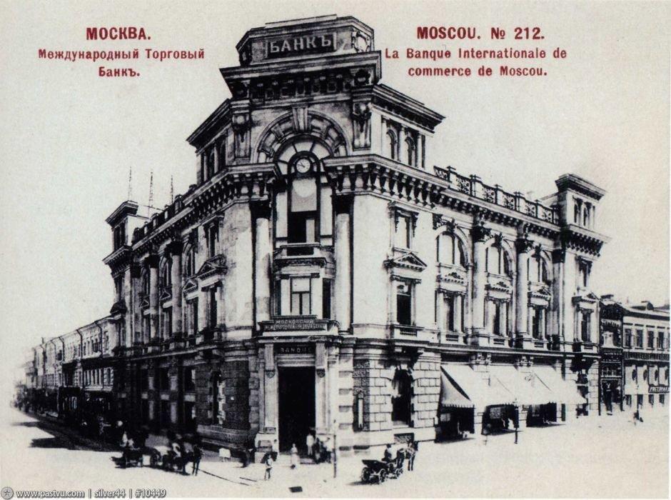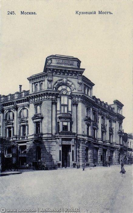 В 70-х гг. XVIII в. этот участок на углу Кузнецкого моста принадлежал графу И.И. Воронцову. В самом конце столетия огромное воронцовское владение, раскинувшееся от Рождественки до Петровки, было поделено на несколько частей, принадлежавших разным хозяевам. Владельцы менялись, и в 1875 г. данный участок перешел к первогильдейскому купцу И.Г. Фирсанову, а позже — к его дочери Вере Фирсановой. В середине 1890-х она продала это владение Московскому международному торговому банку, основанному Л.С. Поляковым. Концессионер при строительстве железных дорог, владелец «Банкирского дома Полякова», создатель целого ряда российских банков, наконец, тайный советник, пожалованный потомственным дворянством, Поляков начал здесь, на Кузнецком мосту, строительство банковского здания.