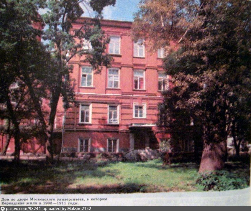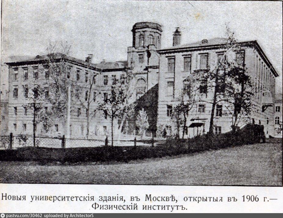 Рост потребностей Московского Университета привелк строительству в 1904 г. специального здания Физического института. Здание института приближено к Моховой справа от комплекса Д.Жилярди и видно позади Института геологии, построенного под руководством Р.И.Клейна в 1910 – 1918 гг. Здание Физического института из красного кирпича имеет план в форме «Н», по бокам центрального корпуса, перпендикулярного Моховой, выстроены небольшие ризалиты, параллельные основной трассе.
