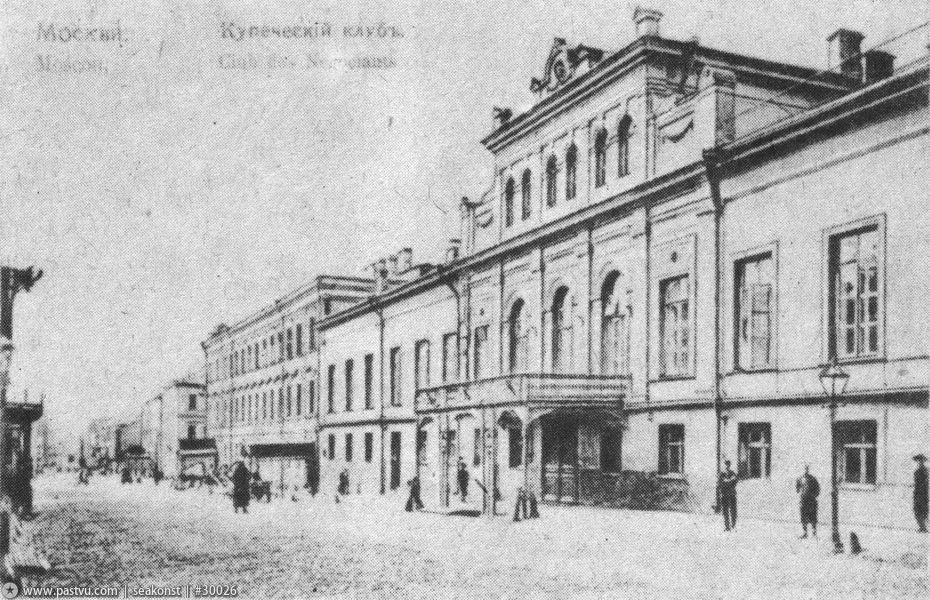В 1839 году здесь разместился Купеческий клуб. В 1843 году в клубе выступал Ференц Лист. В 1857 году Лев Толстой принимал участие в дискуссии об отмене в России крепостного права, и, разумеется (клуб-то купеческий), заседали тут московские предприниматели. Тем более что и кухня здесь очень славилась — Гоголь даже специально заходил. Хотя Николай Васильевич и любил кухню Английского клуба, стряпня повара Купеческого клуба Порфирия нравилась ему больше — в первую очередь из-за того, что была пожирнее и посытнее. Пространное меню клуба, подаваемое на «вторничных» обедах, описано даже у Гиляровского: уха стерляжья, осетры двухаршинные, телятина банкетная, индейка, кормлённая грецкими орехами, поросята с хреном и кашей, каплуны и пулярки…