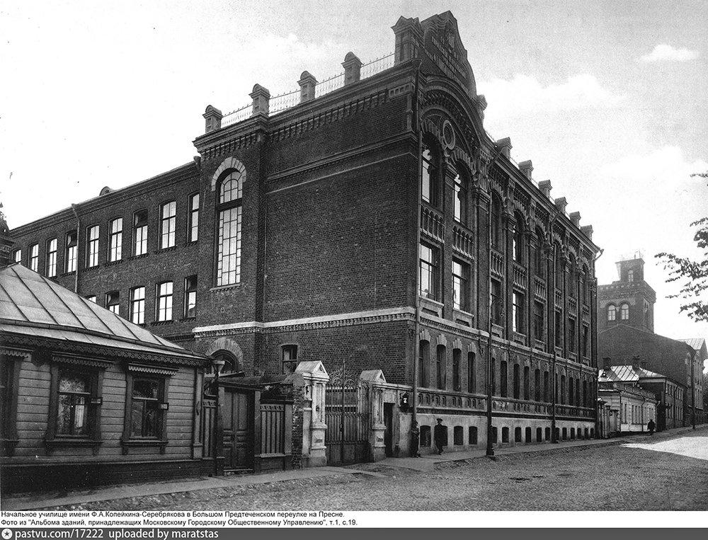 Училище строилось на средства фабриканта Ф. А. Копейкина-Серебрякова. Сам Федор Архипович умер в 1900 г. и перед смертью завещал 200 тысяч рублей городу на строительство мужского и женского училищ. Копейкины-Серебряковы владели водочным заводом на Новой Басманной, свечным и мыловаренным заводами на Пресне, доходным домом в Малом Кисловском переулке.