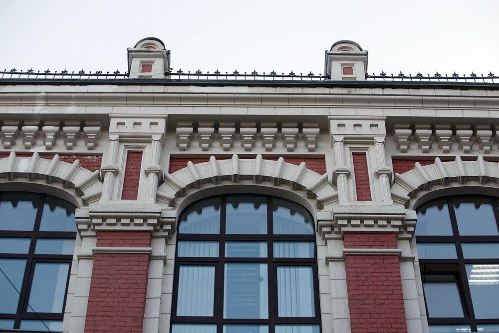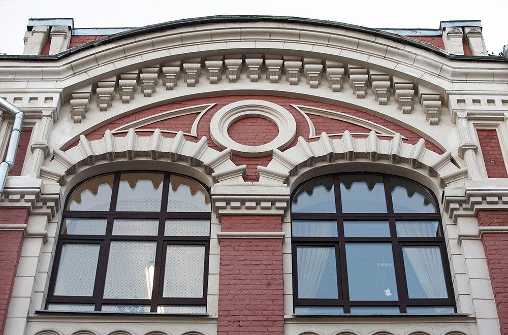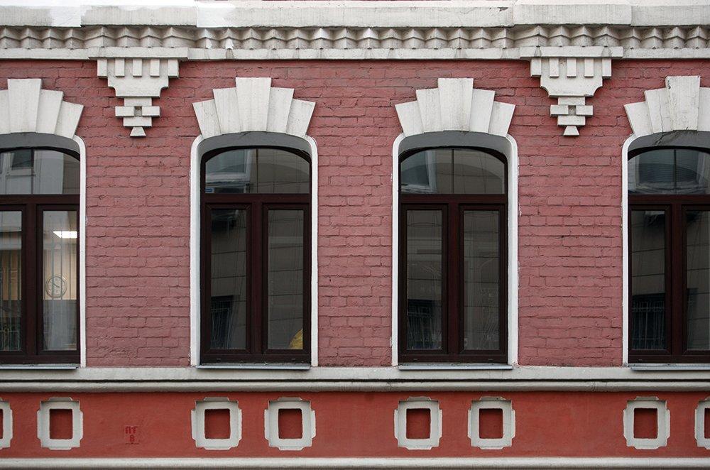 Здание асимметрично. Две левые оси окон объединены сверху скругленной частью карниза. Такая дугообразная часть карниза, напоминающая большую арку и объединяющая круглую нишу и два арочных окна верхнего этажа, отсылает к приемам итальянского романского стиля и раннего Ренессанса. Подобный прием архитектор уже использовал в оформлении здания училища им. Гоголя на Большой Калитниковской.
