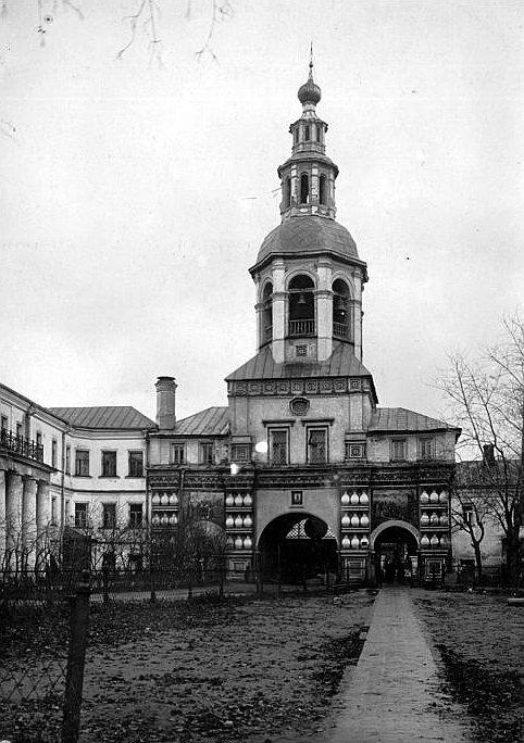 Нижняя половина ансамбля, представляющая собой трехпролетные ворота с большой аркой в центре и двумя боковыми малыми арками (последние ныне заложены), пышно украшена балясинами и ширинками. Церковь Симеона Столпника, созданная позднее, выглядит более скромно. Над четвериком поставлена восьмигранная колокольня с арочными проемами для звонницы, увенчанная двумя восьмериками с луковичной главкой. В 1890 году внутри монастыря была выстроена больница для монахов Московской епархии, Симеоновская церковь стала больничной. Особую ценность представляли 18 колоколов даниловской звонницы, самые старые из которых относились к 1682 году. Этот подбор считался одним из лучших и наиболее мелодичных в Москве.