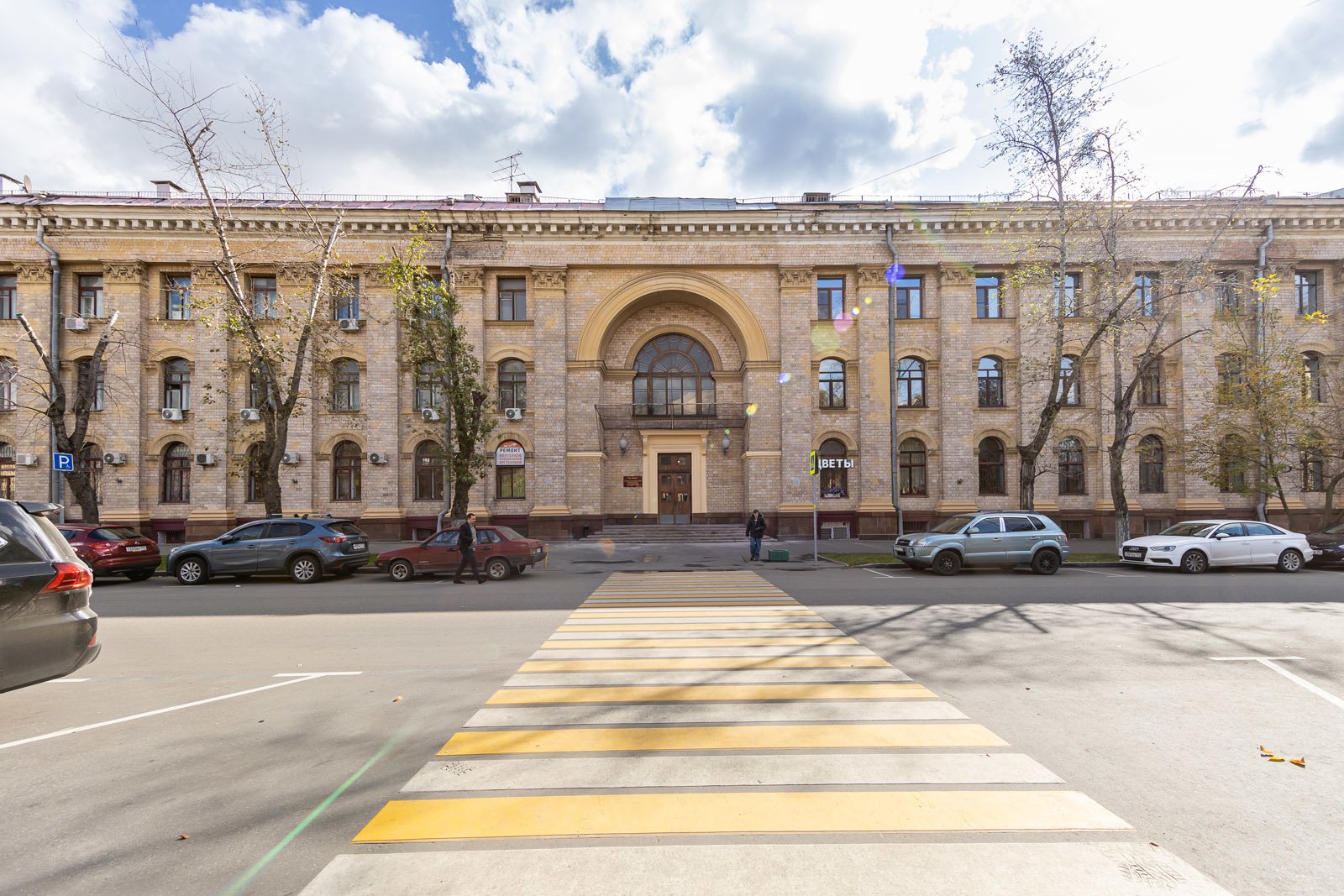 Первое, на что следует обратить внимание, оказавшись возле этого трехэтажного советского здания – гармоничность его окружения, и не только архитектурная. Небольшая площадь рядом со станцией метро «Аэропорт» в 1950-е годы стала научным центром Ленинградского проспекта. Вокруг нее было возведено сразу несколько построек – как учебных, так и научно-исследовательских.