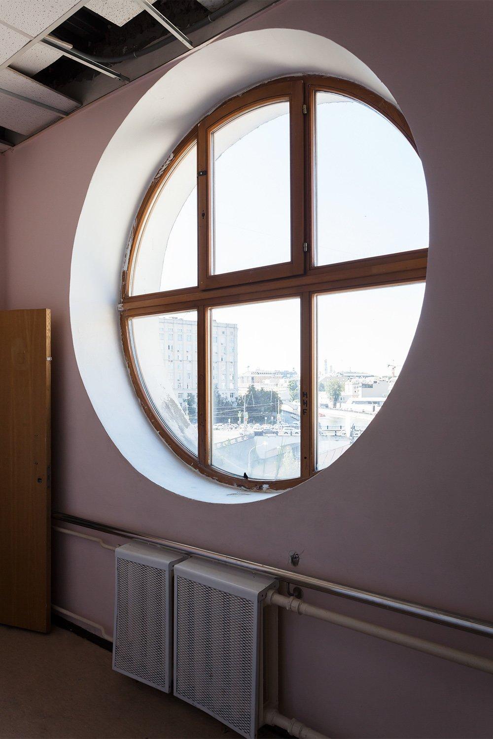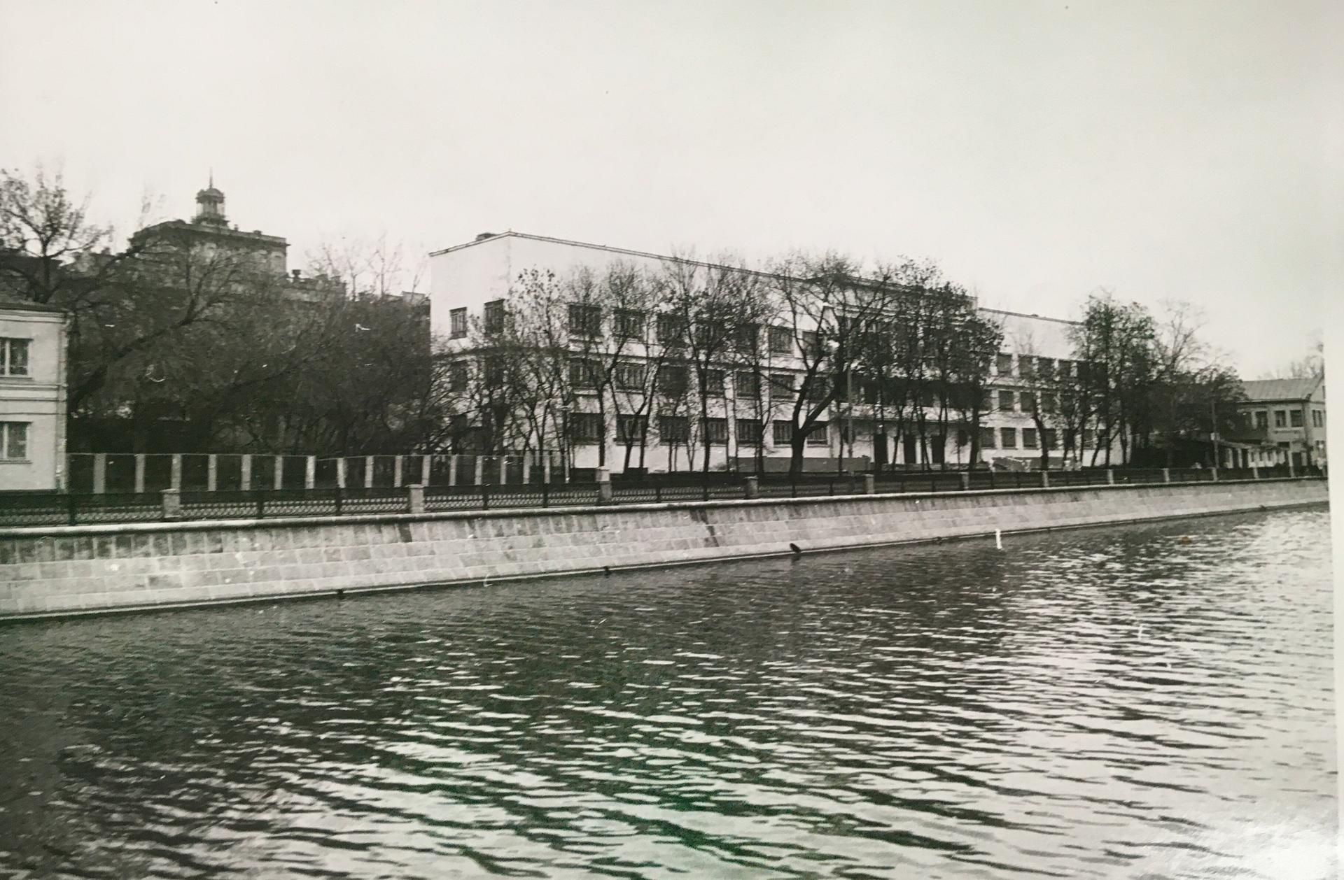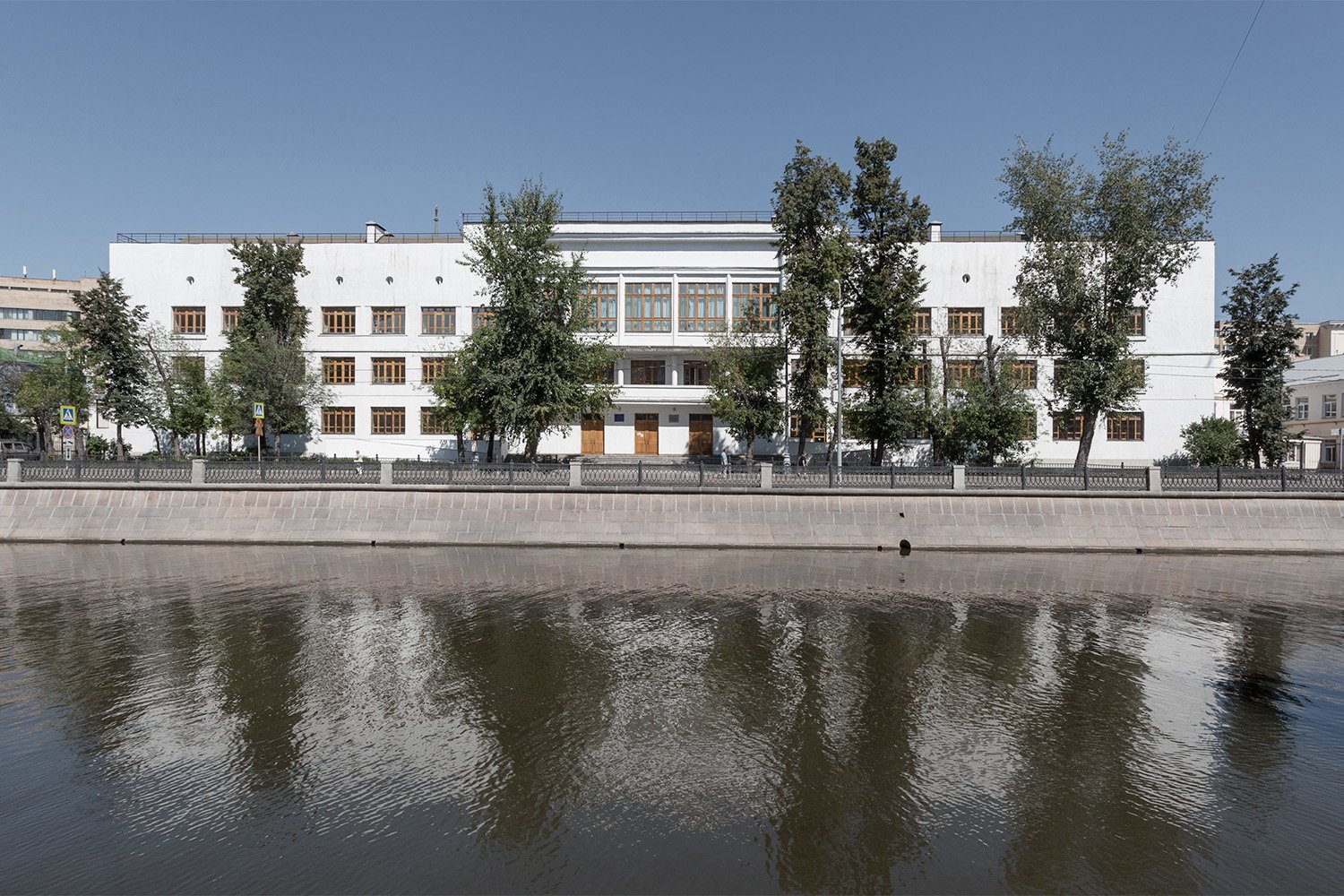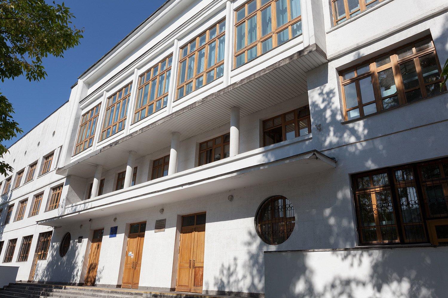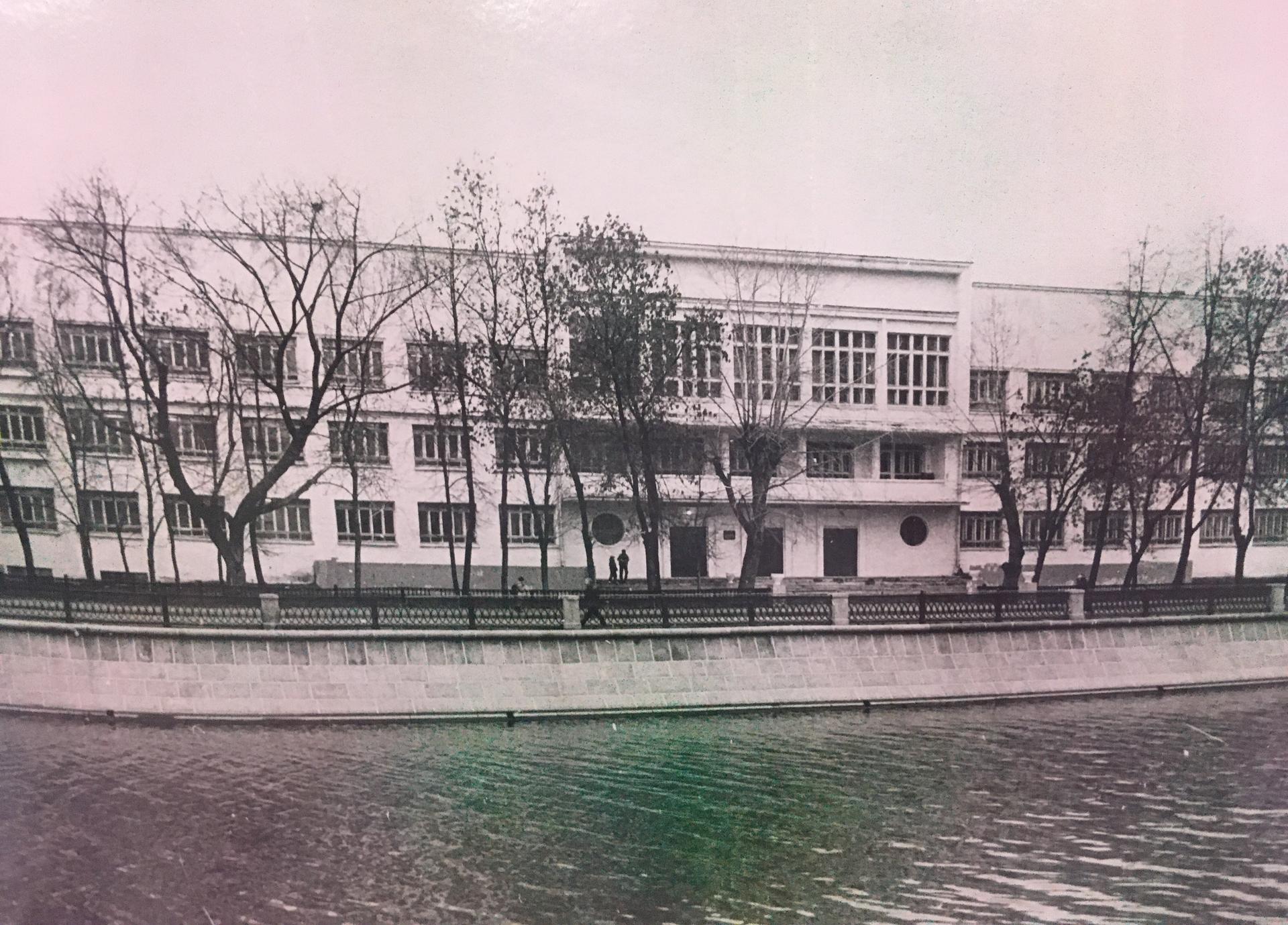 Школа была открыта в 1935 г., историки и искусствоведы относят здание к периоду постконструктивизма. Характерный для этого стиля фасад с выделенным «экраном» в рамке в центре (обозначающим самое главное помещение школы – актовый зал), круглые окна, большой аттик, стойки-столбы в лоджии (библиотека и учительские) и прочие тонко прорисованные детали в сочетании с удачным положением на набережной спасли здание от сноса в 1996 г. Нужно отметить, что также сохранилась первоначальная планировка здания, подчиненная организации учебного процесса. Архитекторы придавали особое значение пространственной взаимосвязи помещений: из центрального вестибюля, расчлененного многочисленными колоннами и расположенного ниже уровня коридоров и классов, ступени ведут в холлы, ориентированные на парадные лестницы с ленточными окнами до потолка, круглые плафоны которых перекликаются с деталями декоративного убранства вестибюля. Сохранилось также оформление учебных помещений, коридоров и холла перед актовым залом.