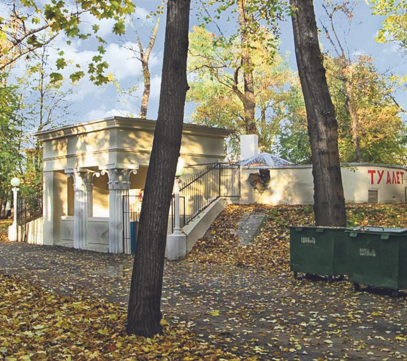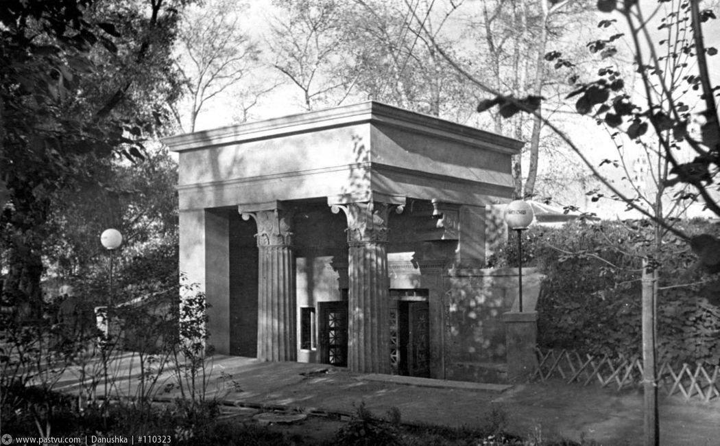 На Пушкинской набережной в ЦПКиО им. Горького и сегодня можно увидеть небольшой павильон в классических формах: канелированные колонны с капителями - фантазией на тему коринфского ордера, несколько вытянутого по вертикали, поддерживают широкий аттик крыши. С одной стороны это сооружение символизировало дух времени и поддерживало архитектурные традиции «большого сталинского стиля», с другой решало проблему с общественными уборными в развивающейся и разрастающейся Москве.