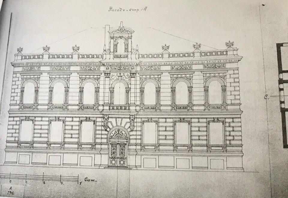 Сохранившийся проект парадного северного фасада решен в стиле эклектики. Фасад симметричен. Главный вход располагался по центру фасада и был выделен небольшим ризалитом, над которым в уровне второго этажа располагался балкон, фланкированный лопатками.