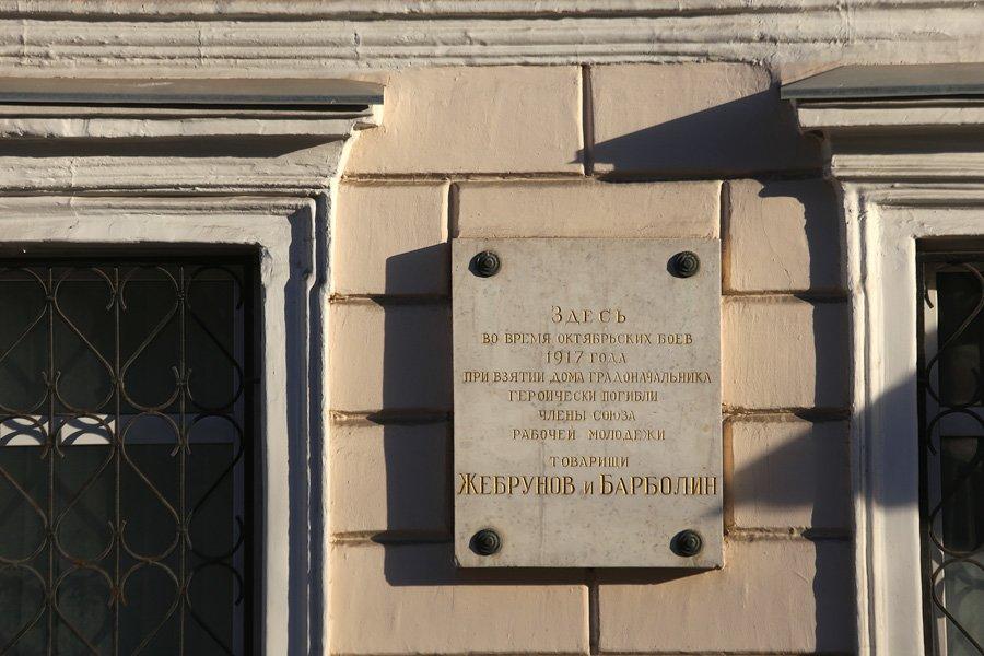 На здании можно увидеть мемориальную доску в память о погибших при взятии Дома Градоначальника в 1917 году членах Союза рабочей молодёжи Жебрунове и Барболине. Доска установлена в 1958 году.