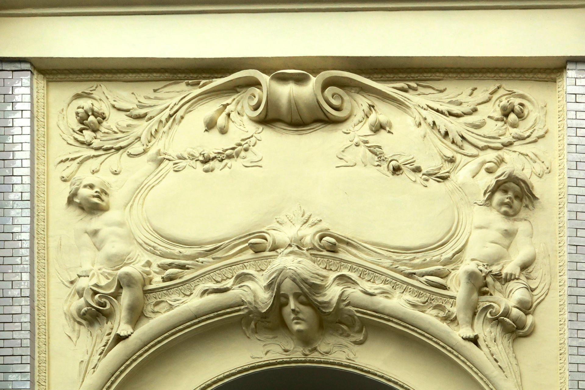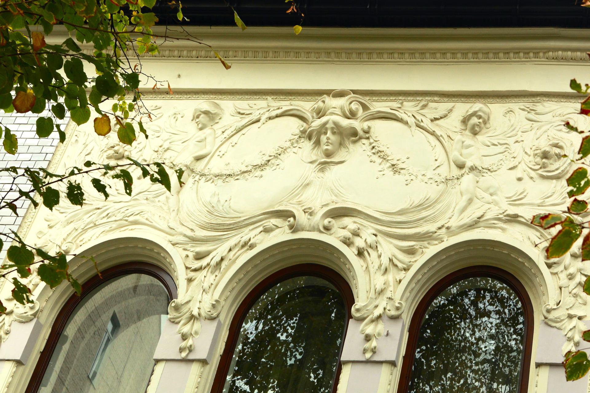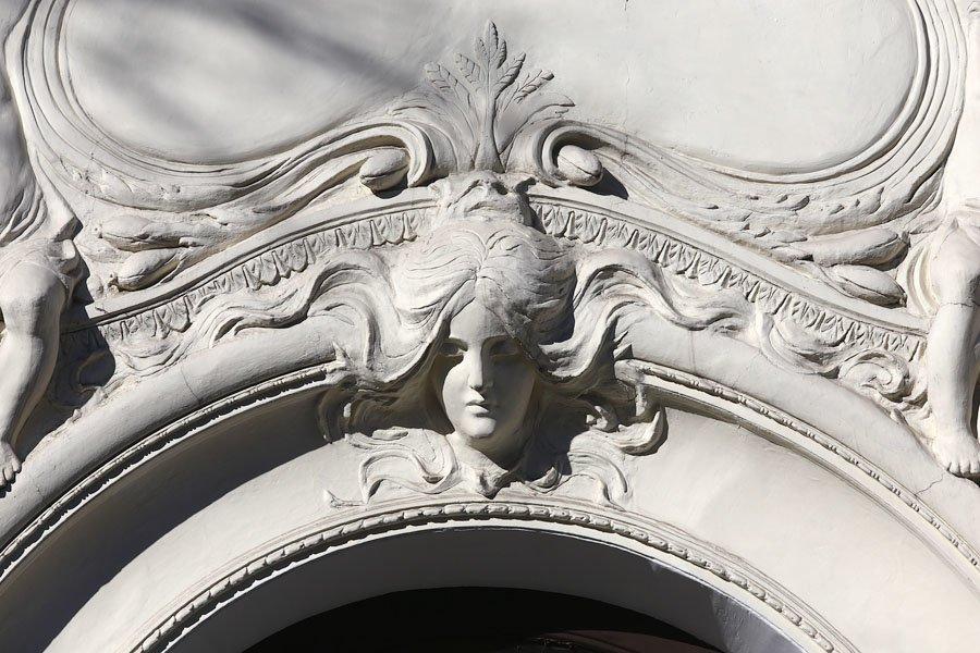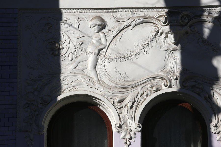 Особняк был облицован керамической плиткой, которая с годами начала трескаться и выцветать. Реставраторы не только устранили все повреждения, но и создали новые плитки, которые точно соответствовали оригиналу по форме и цвету. Для сохранения эффекта игры цвета на фасаде было использовано пять различных оттенков плитки. Кроме того, были восстановлены лепные панно с изображением младенцев путти - маленьких мальчиков с крыльями, которые являются излюбленным декоративным мотивом в искусстве.