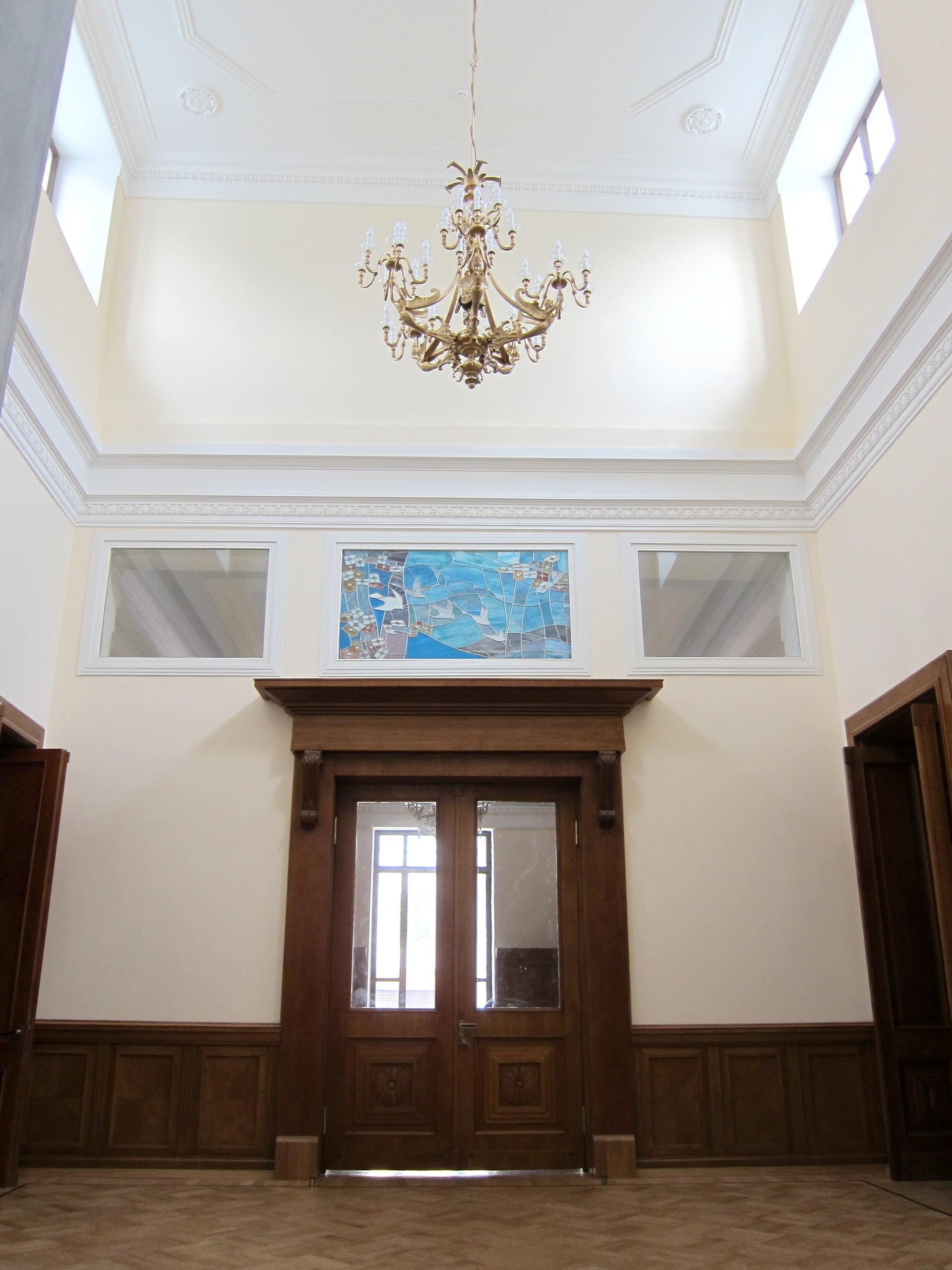 Витражи, украшающие особняк, были в плачевном состоянии. Некоторые из них пришлось демонтировать и отправить в специализированные мастерские для реставрации. Особенно сложным оказался витраж в холле, изображающий голубое небо, летящих птиц и стилизованные цветы. Витражи были восстановлены с использованием традиционных технологий, что позволило вернуть им первоначальный блеск и цветовую насыщенность.