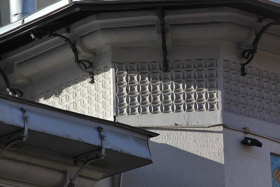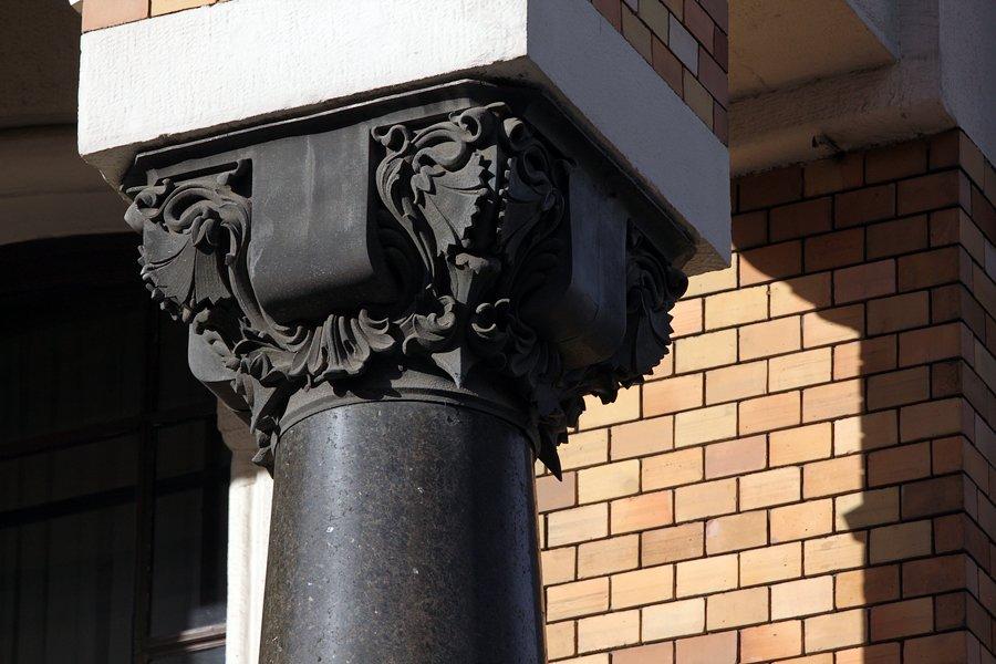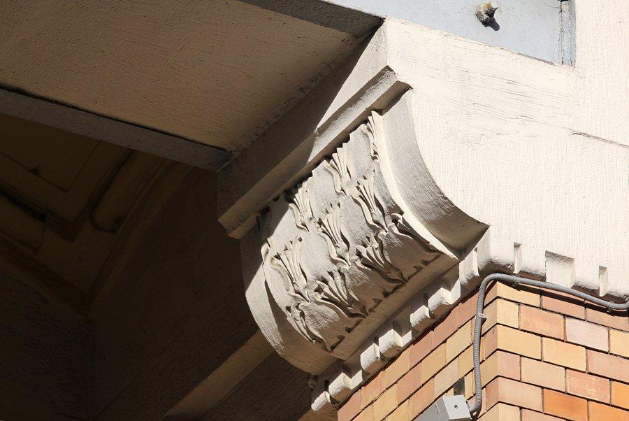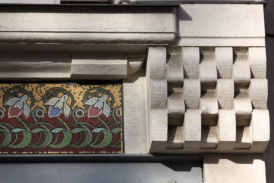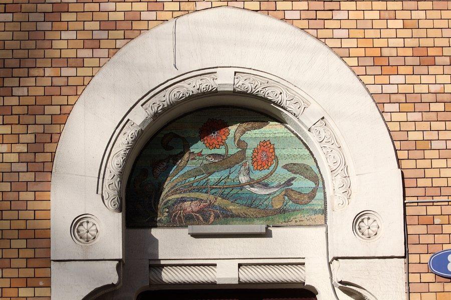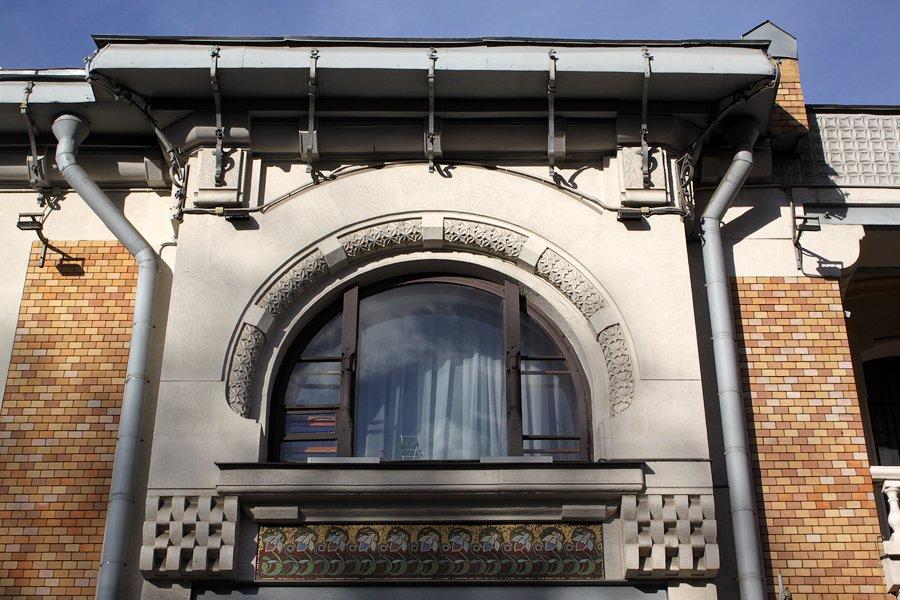 Небольшой, отделанный желтоватым тарусским мрамором и плиткой, особняк, с оригинальной угловой лоджией, выделяется своим мозаичным декором – панно над главным входом, с изображением подводного царства, и цветочным фризом. Панно было создано еще одним выдающимся мастером модерна – архитектором Вильямом Валькотом, о чем свидетельствует его авторская подпись в нижнем углу – латинские буквы W.W.