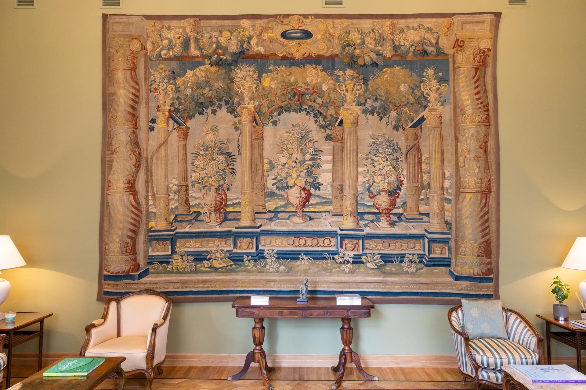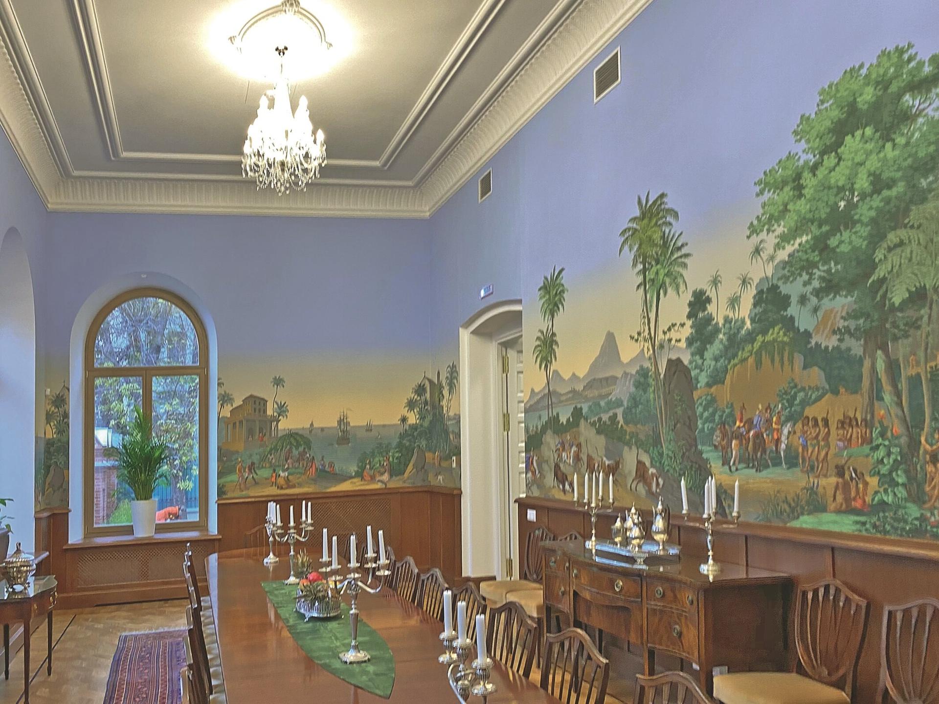 Настоящим украшением интерьера стали редкие обои в обеденном зале, изготовленные на заказ на французской фабрике Zuber по технологиям XIX века. Обои созданы по мотивам гравюр баварского художника Йоганна Морица Ругендаса с частичными изменениями, выполненными российским художником Иваном Евгеньевичем Алферовым. Ругендас принимал участие в первой русской научной экспедиции Григория Ивановича. Лангсдорфа во внутренние районы Бразилии в 1820-е годы, что придаёт этому элементу декора особую связь с нынешним назначением здания.