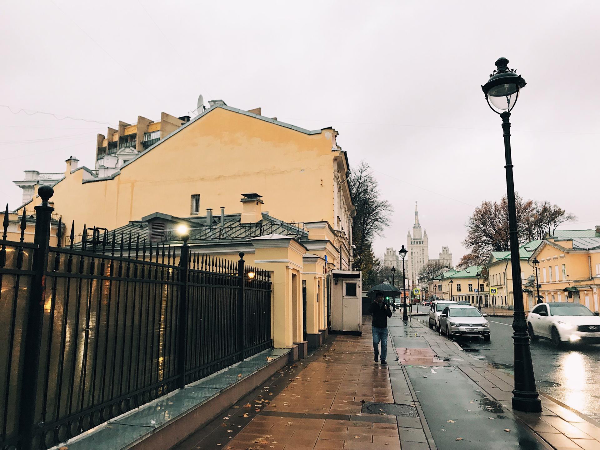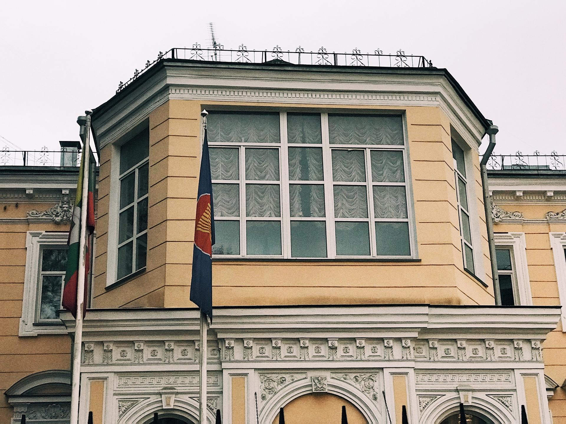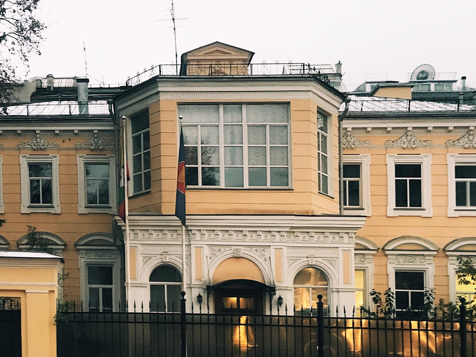 Посольство Мьянмы занимает на Большой Никитской очень интересный особняк. И хотя архитектурное решение его не очень пышно, решено в типичный формах рядовой застройки, но выделяется оно красивый застекленным фонарем над портиком входа.