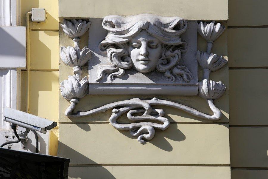 Фасад дома оформлен просто, но изысканно – горизонтальный руст, выразительные наличники окон, лепные фризы и маскароны в виде изящных женских головок. Симметрично расположенные подъезды декорированы металлическими козырьками с растительным орнаментом. Центр фасада выделен ложным эркером с полукруглой нишей, украшенным изысканной лепной композицией с изображением женской головки и цветка ириса со стеблем и листьями.