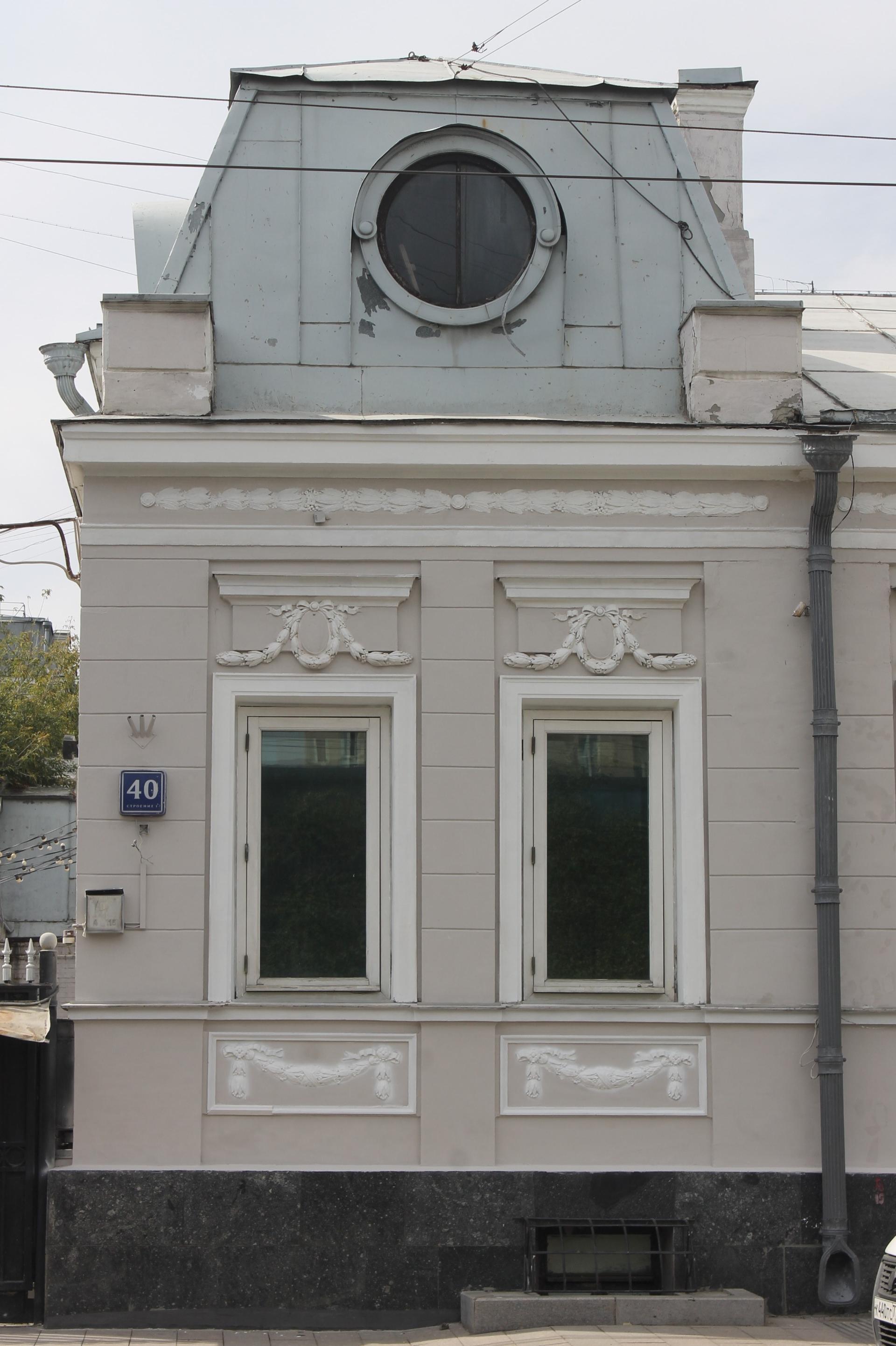 Правую часть здания возвел архитектор С.Ф. Воскресенский в 1913 г., ранее творивший в стиле модерн, но ко времени работы на Новокузнецкой улице перешедшему к неоклассицизму. С.Ф. Воскресенский придал зданию ступенчатость, отдельные его части несколько сдвинуты в глубину участка, а другие, напротив, выдвинуты на улицу. Благодаря этому средняя часть особняка поставлена с небольшим отступом от красной линии, а между нею и выступающими частями разбит палисадник с оградой. Вход в дом осуществляется через крыльцо в правой части особняка. Фасады украшены растительным декором с лентами.