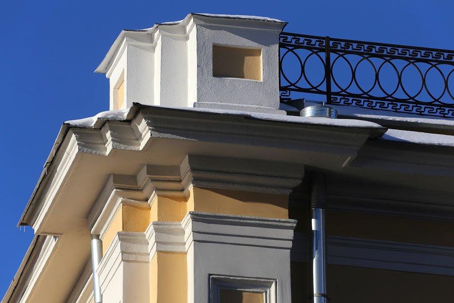 Дом строился в годы, когда архитектура классицизма уже не была востребована в частном строительстве. Общество хотело чего-то другого, более романтичного и свободного от классических канонов. Перед нами пример переходного стиля. Архитектор ещё во многом следует практике классицизма. Здание симметрично, центр фасада занимают три высоких окна, второй этаж главный, первый трактован как постамент, цоколь под парадным этажом. Но углы и дома, и центрального ризалита, обработаны преувеличенно массивными лопатками. Для их облегчения автор применил узкие высокие филёнки. Центральные окна объединены тремя арками, опирающимися на канеллированные пилястры. Междуэтажный карниз преувеличенно массивен, зато венчающий здание карниз лёгок. Он сделан с использованием огромного для такого дома выноса. Столь далеко вынесенный карниз даёт сильную полосу тени на фасаде. Над карнизом поставлен небольшой аттик, заключённый в пространство между двух тумб. По сторонам аттика поставлены лёгкие решётки, что было невозможно в эпоху классицизма. Высота второго этажа преувеличенно большая, над окнами оставлено большое ничем не заполненное поле, подчёркнутое широкой тенью карниза.