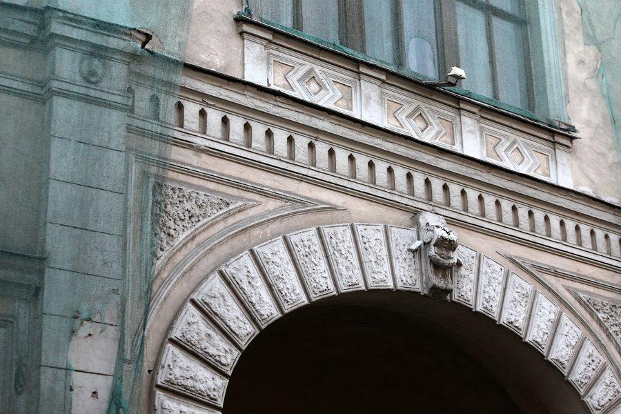 От сохранившегося зеркального тамбура при входе в дом уцелели лишь несколько образцов облицовки. По их подобию были воссозданы и другие его элементы.